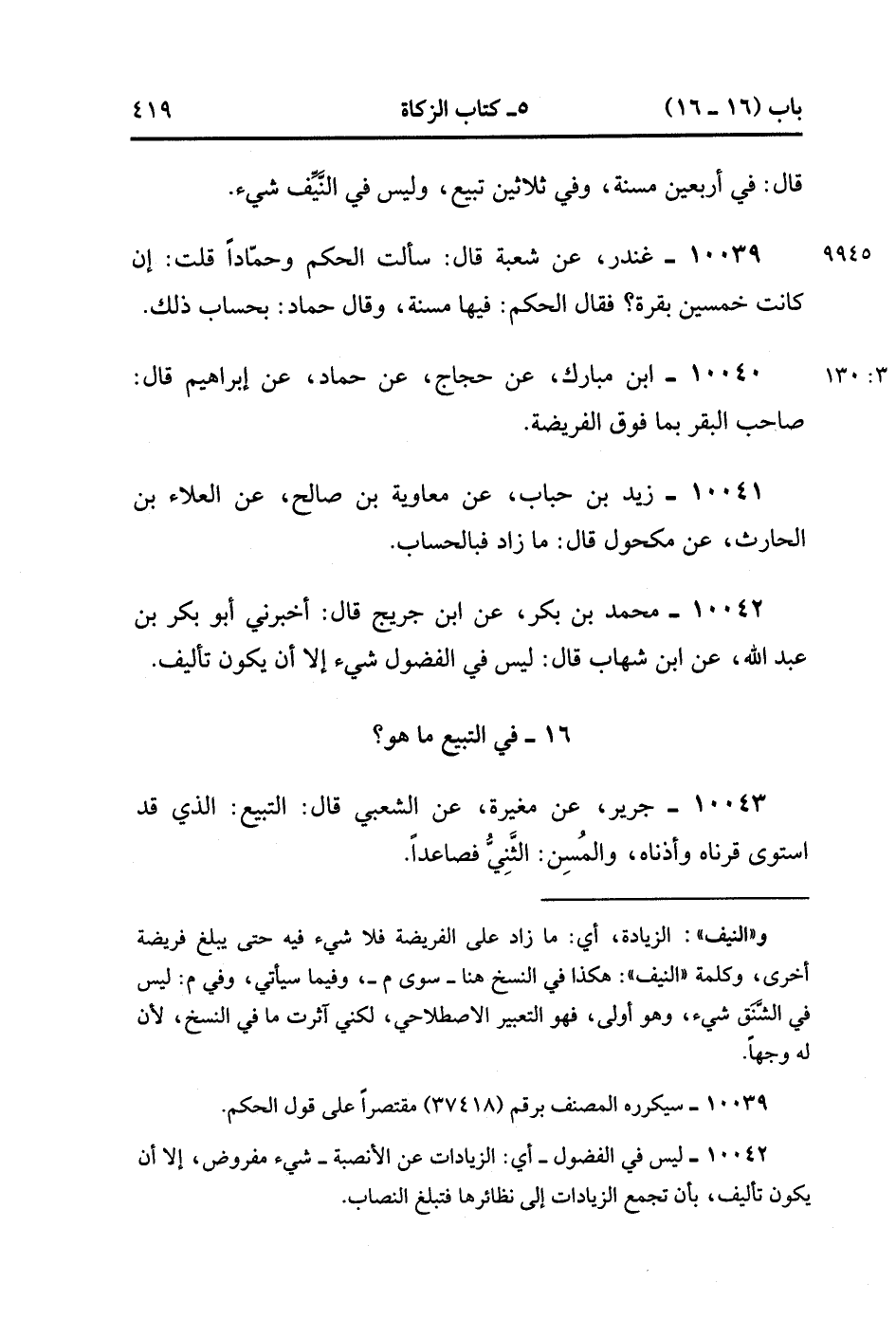 10043- حَدَّثَنَا جَرِيرٌ ، عَنْ مُغِيرَةَ ، عَنِ الشَّعْبِيِّ ، قَالَ : التَّبِيعُ : الَّذِي قَدَ اسْتَوَى قَرْنَاهُ وَأُذُنَاهُ ، وَالْمُسِنُّ : الثَّنِيُّ فَصَاعِدًا. (3/130).