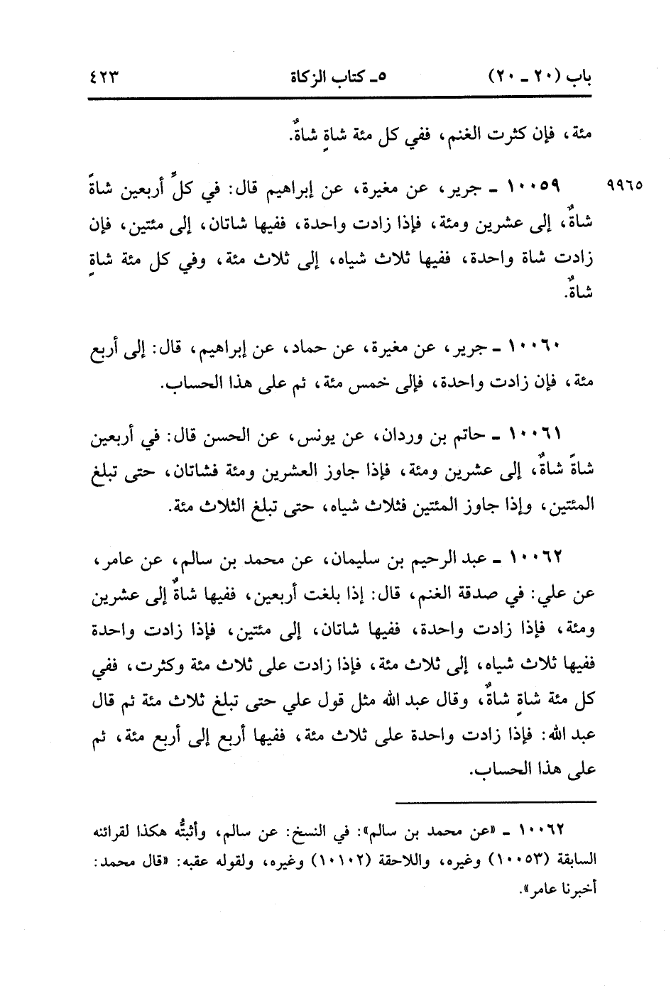 10062- حَدَّثَنَا عَبْدُ الرَّحِيمِ بْنُ سُلَيْمَانَ ، عَنْ مُحَمَّدِ بْنِ سَالِمٍ ، عَنْ عَامِرٍ ، عَنْ عَلِيٍّ ، فِي صَدَقَةِ الْغَنَمِ ، قَالَ : إذَا بَلَغَتْ أَرْبَعِينَ فَفِيهَا شَاةٌ إلَى عِشْرِينَ وَمِئَةٍ ، فَإِذَا زَادَتْ وَاحِدَةً فَفِيهَا شَاتَانِ إلَى مِئَتَيْنِ ، فَإِذَا زَادَتْ وَاحِدَةً فَفِيهَا ثَلاَثُ شِيَاهٍ إلَى ثَلاَثِ مِئَةٍ ، فَإِذَا زَادَتْ عَلَى ثَلاَثِ مِئَةٍ وَكَثُرَتْ فَفِي كُلِّ مِئَةِ شَاةٍ شَاةٌ ، وَقَالَ عَبْدُ اللهِ مِثْلَ قَوْلِ عَلِيٍّ حَتَّى تَبْلُغَ ثَلاَثَ مِئَةٍ ، ثُمَّ قَالَ عَبْدُ اللهِ : فَإِذَا زَادَتْ وَاحِدَةً عَلَى ثَلاَثِ مِئَةٍ فَفِيهَا أَرْبَعٌ إلَى أَرْبَعِ مِئَةٍ ، ثُمَّ عَلَى هَذَا الْحِسَابِ.