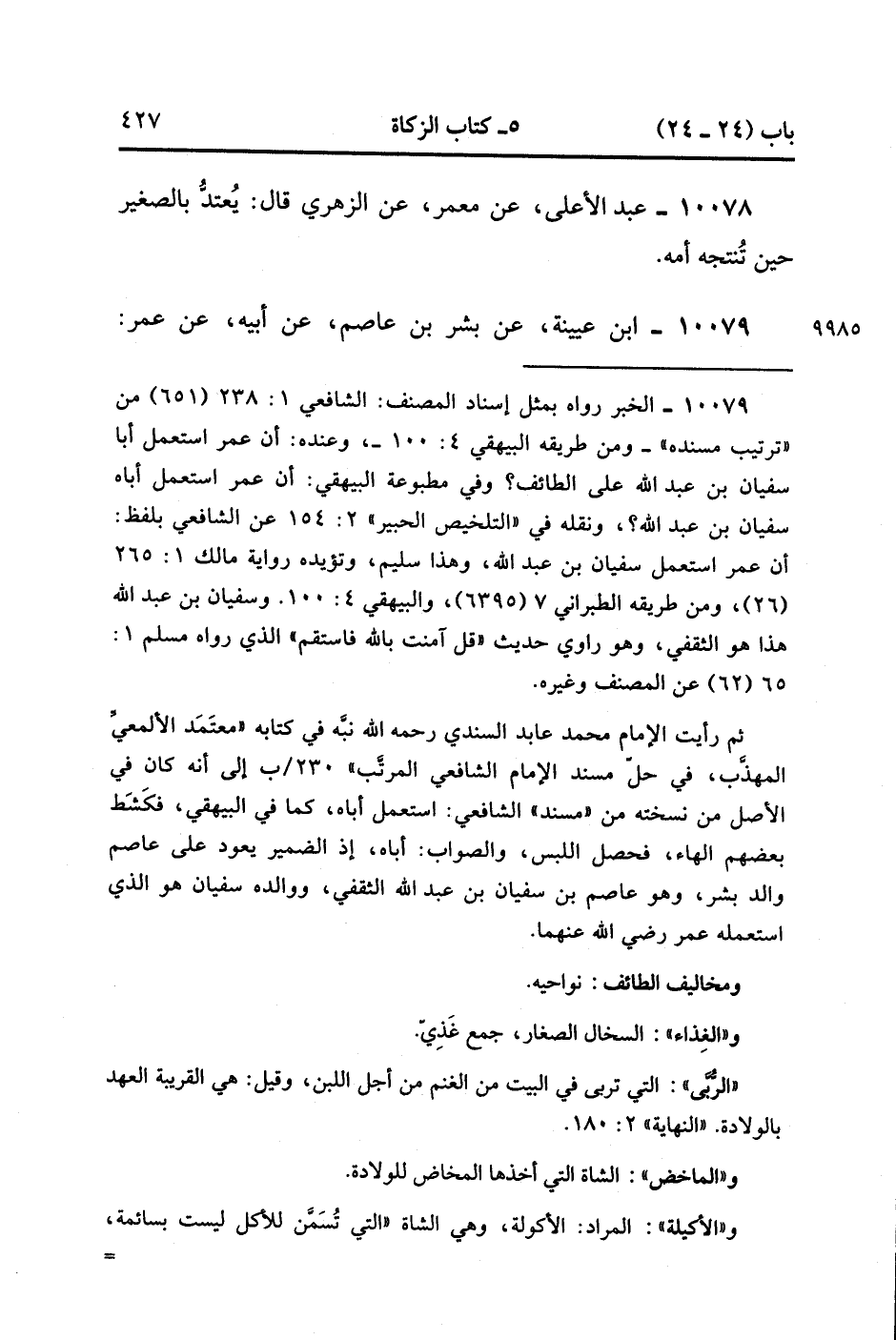 10079- حَدَّثَنَا ابْنُ عُيَيْنَةَ ، عَنْ بِشْرِ بْنِ عَاصِمِ ، عَنْ أَبِيهِ ، عَنْ عُمَرَ ؛ اسْتَعْمَلَ أَبَاهُ عَلَى الطَّائِفِ وَمَخَاليفها ، فَكَانَ يُصَدِّقُ فَاعْتَدَّ عَلَيْهِمْ بِالْغِذَاءِ ، فَقَالَ لَهُ النَّاسُ : إِنْ كُنْت مُعْتَدًّا بِالْغِذَاءِ فَخُذْ مِنْهُ ، فَأَمْسَكَ عَنْهُمْ حَتَّى لَقِيَ عُمَرَ ، فَأَخْبَرَهُ بِاَلَّذِي قَالُوا ، فَقَالَ : اعْتَدْ عَلَيْهِمْ بِالْغِذَاءِ ، وَإِنْ جَاءَ بِهَا الرَّاعِي يَحْمِلُهَا عَلَى يَدِهِ ، وَأَخْبِرْهُمْ أَنَّك تَدَعُ لَهُمُ الرَّبَّي وَالْمَاخِضَ وَالأَكِيلَةَ وَفَحْلَ الْغَنَمِ ، وَخُذْ الَعَنَاقَ وَالْجَذَعَةَ وَالثَّنِيَّةَ ، فَذَلِكَ عَدْلٌ بَيْنَ خِيَارِ الْمَالِ وَالْغِذَاءِ. (3/134).