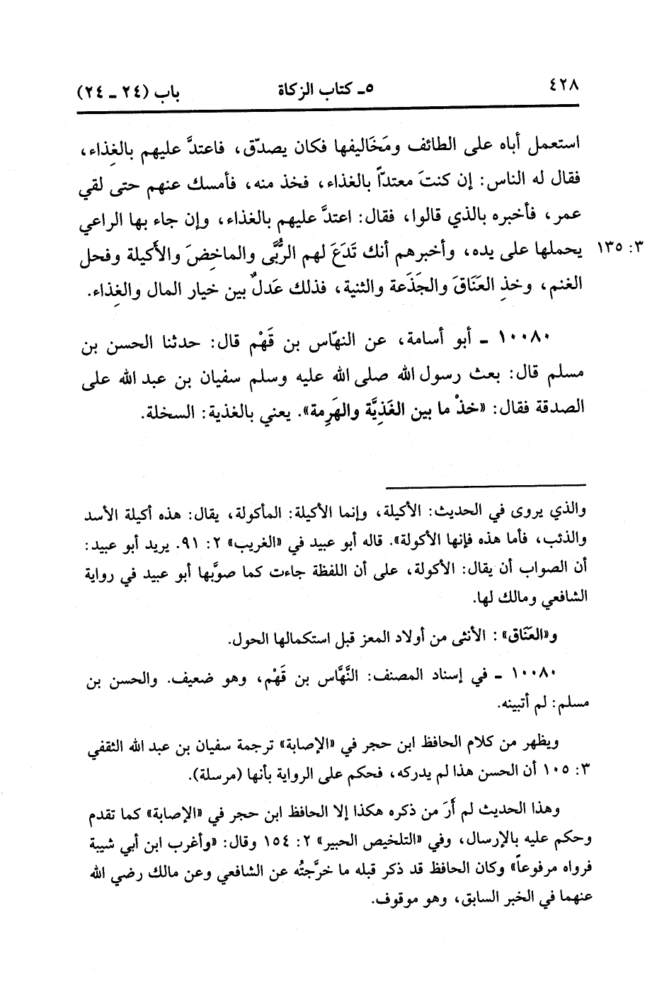 10080- حَدَّثَنَا أَبُو أُسَامَةَ ، عَنِ النَّهَّاسِ بْنِ قَهْمٍ , قَالَ : حدَّثَنَا الْحَسَنُ بْنُ مُسْلِمٍ ، قَالَ : بَعَثَ رَسُولُ اللهِ صَلَّى الله عَلَيْهِ وَسَلَّمَ سُفْيَانَ بْنَ عَبْدِ اللهِ عَلَى الصَّدَقَةِ ، فَقَالَ : خُذْ مَا بَيْنَ الْغَذِيَّةِ ، وَالْهَرِمَةِ ، يَعْنِي بِالْغَذِيَّةِ السَّخْلَةَ. (3/135).