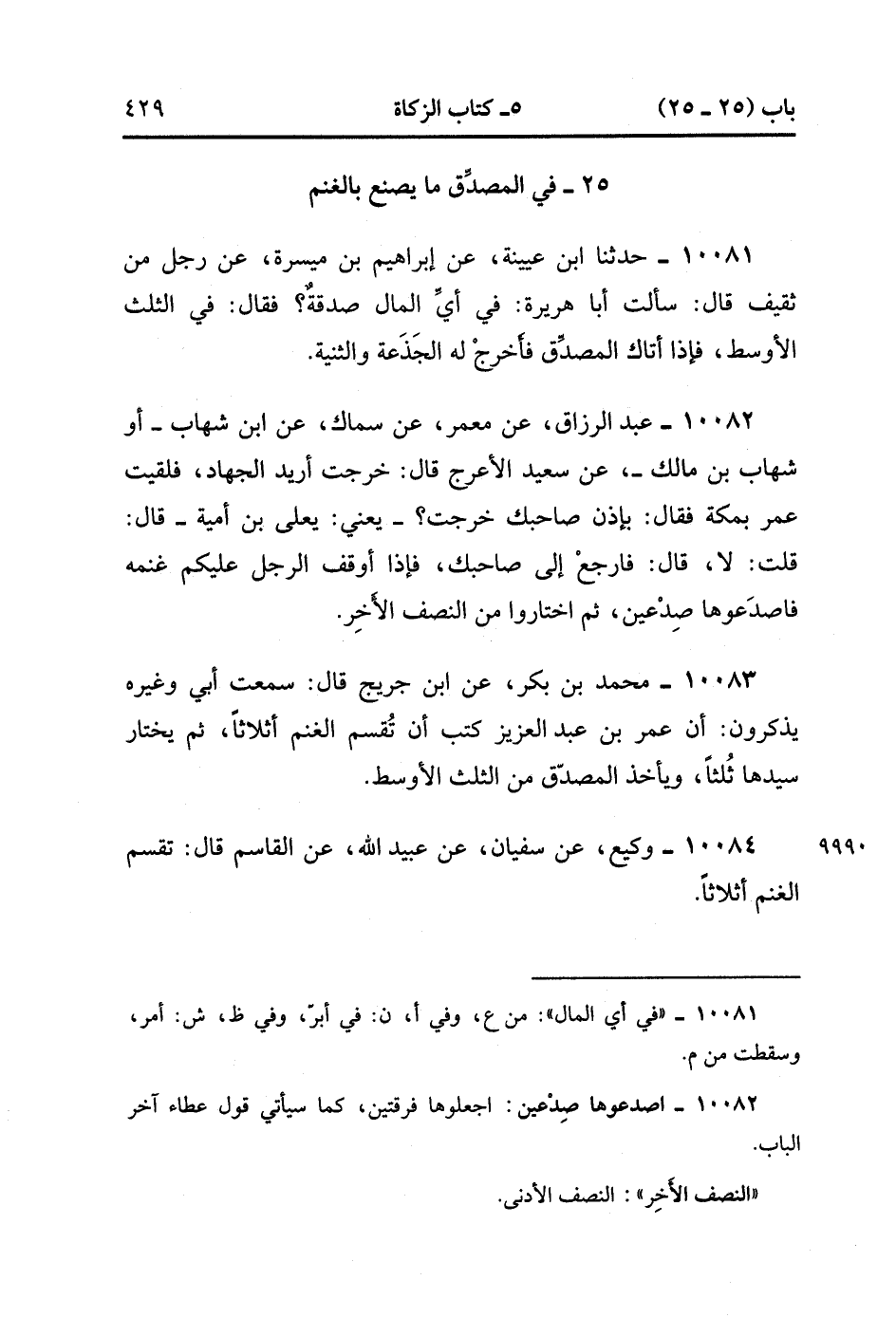 10083- حَدَّثَنَا مُحَمَّدُ بْنُ بَكْرٍ ، عَنِ ابْنِ جُرَيْجٍ ، قَالَ : سَمِعْتُ أَبِي وَغَيْرَهُ يَذْكُرُونَ أَنَّ عُمَرَ بْنَ عَبْدِ الْعَزِيزِ كَتَبَ : أَنْ تُقَسَّمَ الْغَنَمُ أَثْلاَثًا ، ثُمَّ يَخْتَارُ سَيِّدَهَا ثُلُثًا ، وَيَأْخُذُ الْمُصَدِّقَ مِنَ الثُّلُثِ الأَوْسَطِ.