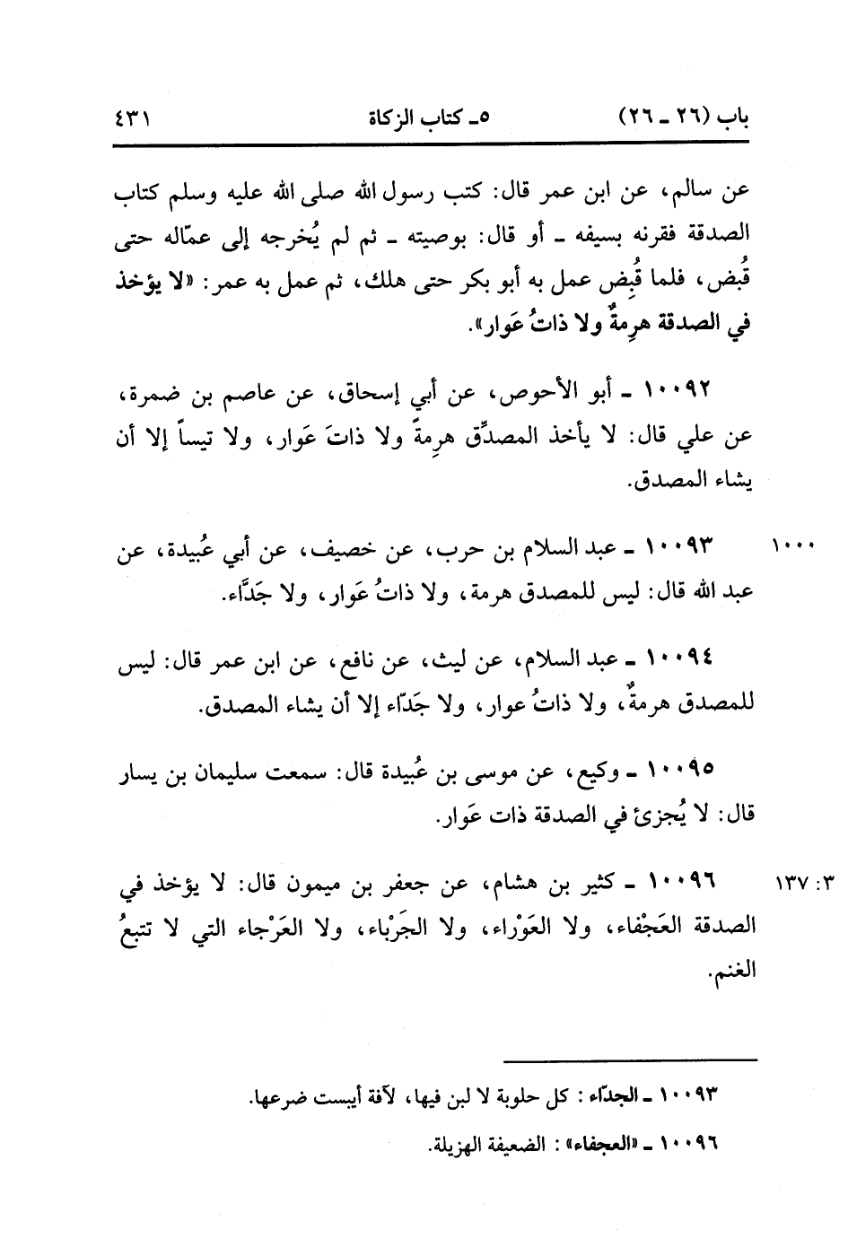 10096- حَدَّثَنَا كَثِيرُ بْنُ هِشَامٍ ، عَنْ جَعْفَرِ بْنِ مَيْمُونٍ ، قَالَ : لاَ يُؤْخَذُ فِي الصَّدَقَةِ الْعَجْفَاءُ ، وَلاَ الْعَوْرَاءُ ، وَلاَ الْجَرْبَاءُ ، وَلاَ الْعَرْجَاءُ الَّتِي لاَ تَتْبَعُ الْغَنَمَ. (3/137).