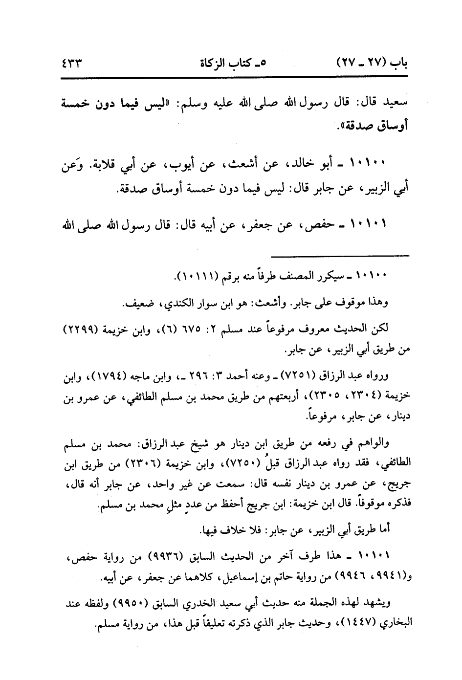 10100- حَدَّثَنَا أَبُو خَالِدٍ ، عَنْ أَشْعَثَ ، عَنْ أَيُّوبَ ، عَنْ أَبِي قِلاَبَةَ (ح) وَعَنْ أَبِي الزُّبَيْرِ ، عَنْ جَابِرٍ ، قَالَ : لَيْسَ فِيمَا دُونَ خَمْسَةِ أَوْسَاقٍ صَدَقَةٌ.