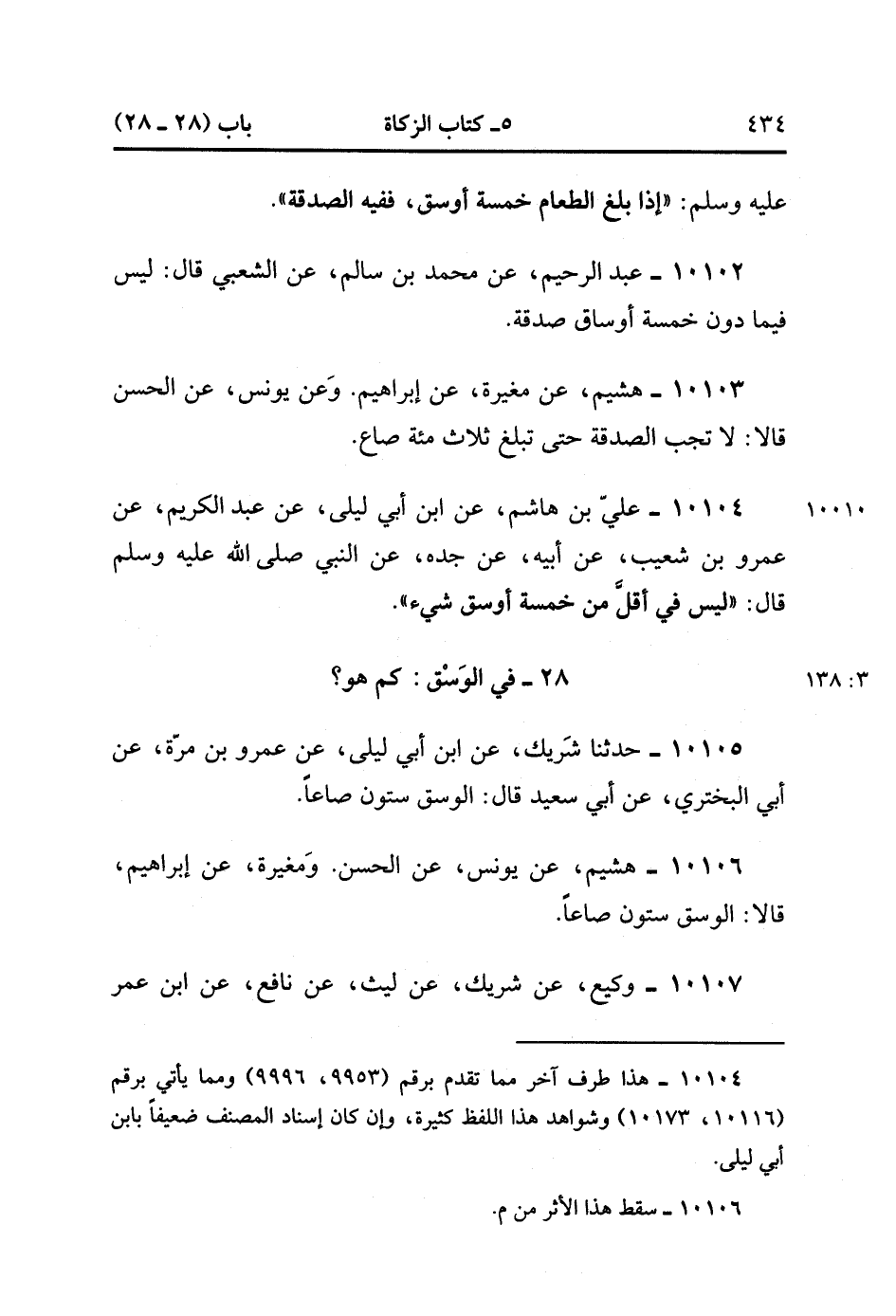 10104- حَدَّثَنَا عَلِيُّ بْنُ هَاشِمٍ ، عَنِ ابْنِ أَبِي لَيْلَى ، عَنْ عَبْدِ الْكَرِيمِ ، عَنْ عَمْرِو بْنِ شُعَيْبٍ ، عَنْ أَبِيهِ ، عَنْ جَدِّهِ ، عَنِ النَّبِيِّ صَلَّى الله عَلَيْهِ وَسَلَّمَ ، قَالَ : لَيْسَ فِي أَقَلَّ مِنْ خَمْسَةِ أَوْسُقٍ شَيْءٌ. (3/137)