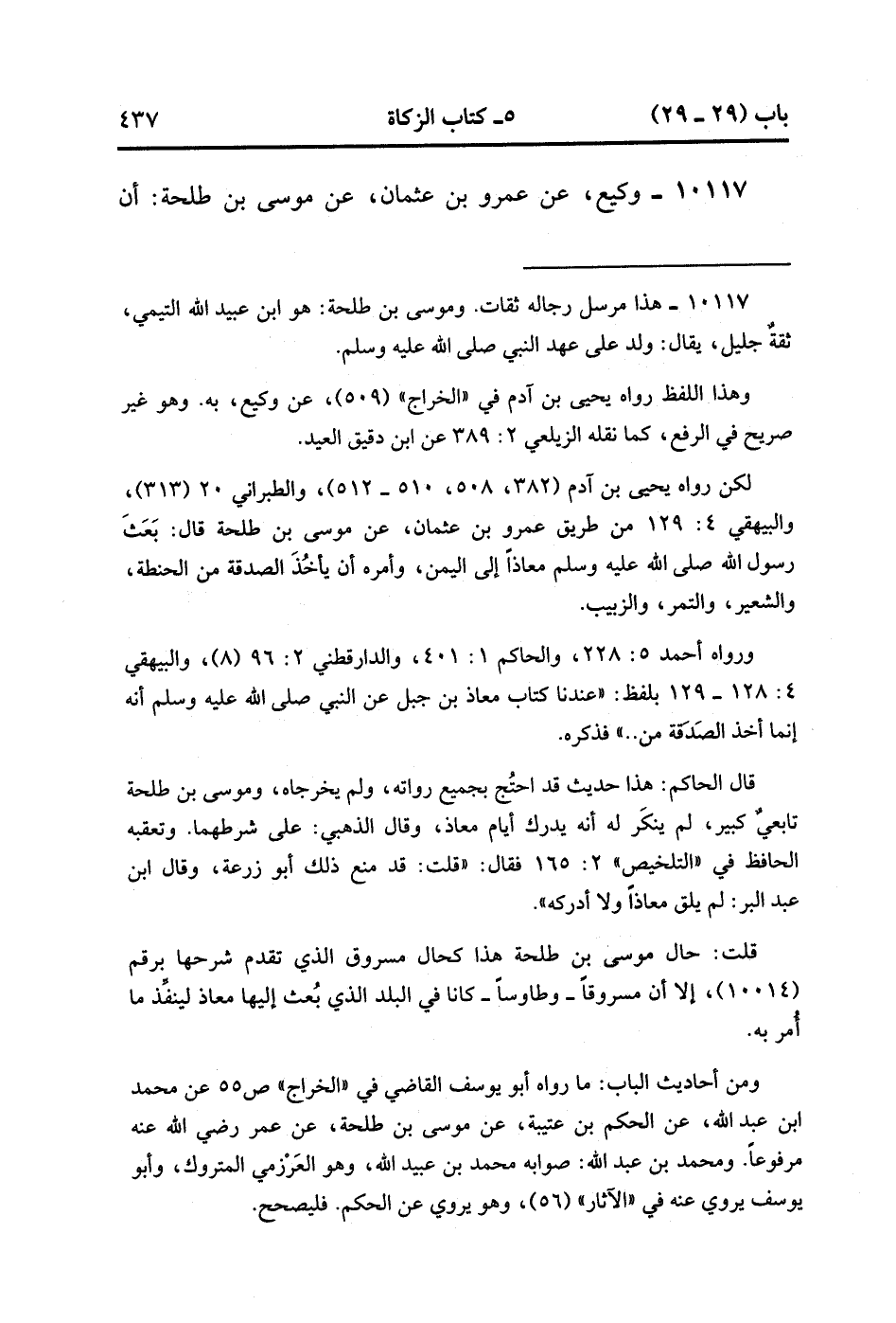 10117- حَدَّثَنَا وَكِيعٌ ، عَنْ عَمْرِو بْنِ عُثْمَانَ ، عَنْ مُوسَى بْنِ طَلْحَةَ ؛ أَنَّ مُعَاذًا لَمَّا قَدِمَ الْيَمَنَ لَمْ يَأْخُذَ الزَّكَاةَ إِلاَّ مِنَ الْحِنْطَةِ ، وَالشَّعِيرِ ، وَالتَّمْرِ ، وَالزَّبِيبِ. (3/138).