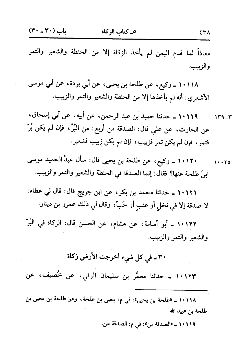 10118- حَدَّثَنَا وَكِيعٌ ، عَنْ طَلْحَةَ بْنِ يَحْيَى ، عَنْ أَبِي بُرْدَةَ ، عَنْ أَبِي مُوسَى الأَشْعَرِيِّ ؛ أَنَّهُ لَمْ يَأْخُذْهَا إِلاَّ مِنَ الْحِنْطَةِ ، وَالشَّعِيرِ ، وَالتَّمْرِ ، وَالزَّبِيبِ. (3/138)