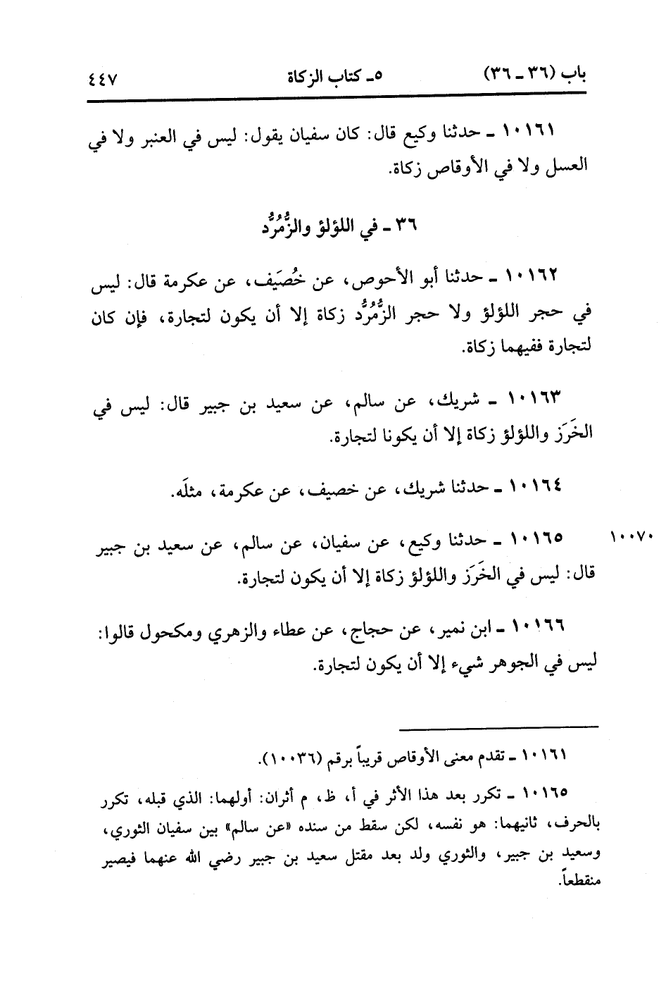 10165- حَدَّثَنَا وَكِيعٌ ، عَنْ سُفْيَانَ ، عَنْ سَالِمٍ ، عَنْ سَعِيدِ بْنِ جُبَيْرٍ ، قَالَ : لَيْسَ فِي الْخَرَزِ وَاللُّؤْلُؤِ زَكَاةٌ ، إِلاَّ أَنْ يَكُونَ لِتِجَارَةٍ.