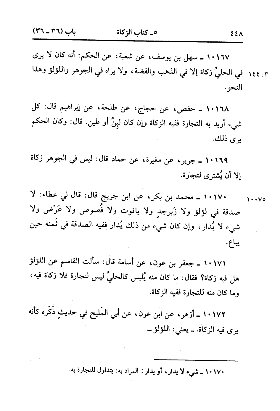 10172- حَدَّثَنَا أَزْهَرُ ، عَنِ ابْنِ عَوْنٍ ، عَنْ أَبِي الْمَلِيحِ ، فِي حَدِيثٍ ذَكَرَهُ ؛ كَأَنَّهُ يَرَى فِيهِ الزَّكَاةَ ، يَعْنِي اللُّؤْلُؤَ. (3/144).