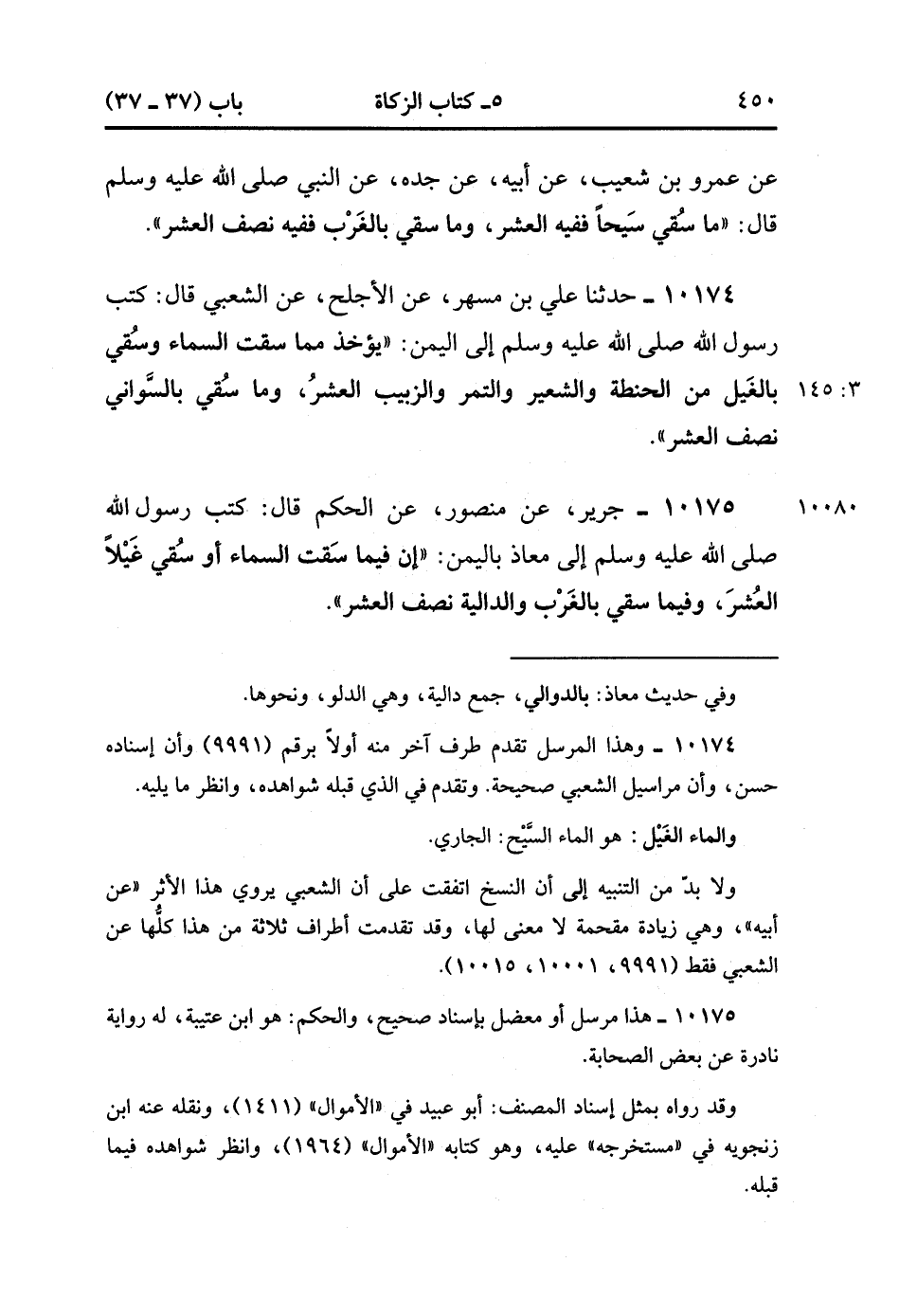 10175- حَدَّثَنَا جَرِيرٌ ، عَنْ مَنْصُورٍ ، عَنِ الْحَكَمِ ، قَالَ : كَتَبَ رَسُولُ اللهِ صَلَّى الله عَلَيْهِ وَسَلَّمَ إلَى مُعَاذٍ بِالْيَمَنِ ، إِنَّ فِيمَا سَقَتِ السَّمَاءُ ، أَوْ سُقِيَ غَيْلاً الْعُشْرَ ، وَفِيمَا سُقِيَ بِالْغُرْبِ وَالدَّالِيَةِ نِصْفَ الْعُشْرِ. (3/145).