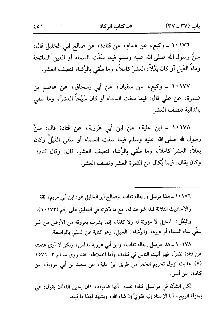 10178- حَدَّثَنَا ابْنُ عُلَيَّةَ ، عَنِ ابْنِ أَبِي عَرُوبَةَ ، عَنْ قَتَادَةَ ، قَالَ : سَنَّ رَسُولُ اللهِ صَلَّى الله عَلَيْهِ وَسَلَّمَ فِيمَا سَقَت السَّمَاءُ ، أَوْ سَقَى الْغَيْلُ ، وَكَانَ بَعْلاً الْعُشْرُ كَامِلاً ، وَمَا سُقِيَ بِالرِّشَاءِ فَنِصْفُ الْعُشْرِ . قَالَ : وَقَالَ قَتَادَةُ : وَكَانَ يُقَالُ : فِيمَا يُكَالُ مِنَ الثَمَرَةِ الْعُشْرُ ، وَنِصْفُ الْعُشْرِ. (3/145).