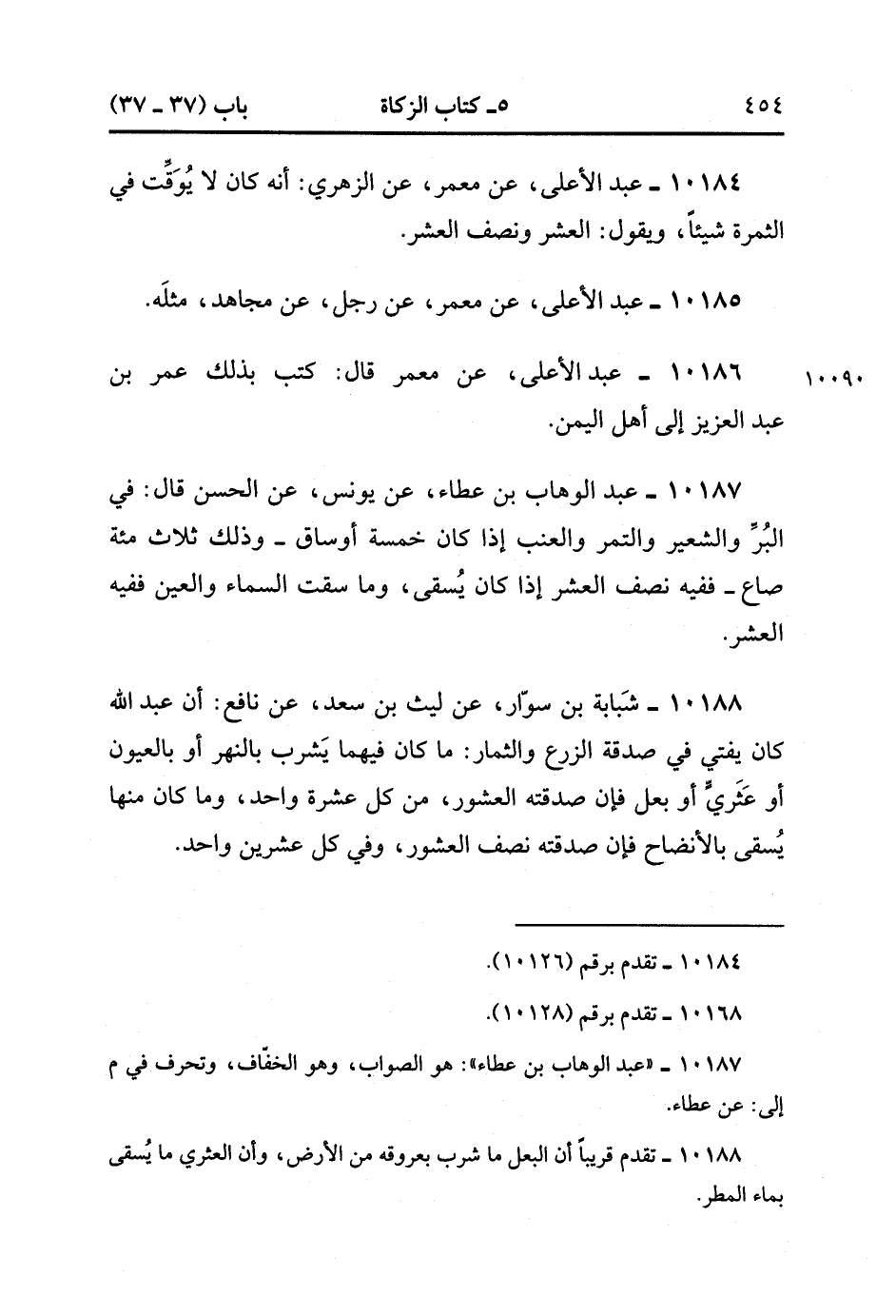10188- حَدَّثَنَا شَبَابَةُ بْنُ سَوَّارٍ ، عَنْ لَيْثٍ بْنِ سَعْدٍ ، عَنْ نَافِعٍ ؛ أَنَّ عَبْدَ اللهِ كَانَ يُفْتِي فِي صَدَقَةِ الزَّرْعِ وَالثِّمَارِ ، مَا كَانَ فِيهِمَا يَشْرَبُ بِالنَّهَرِ ، أَوِ بِالْعيون ، أَوْ عَثَرِيًّا ، أَوْ بَعْلٍ ، فَإِنَّ صَدَقَتَهُ الْعُشُورِ ، مِنْ كُلِّ عَشْرَةٍ وَاحِدٌ ، وَمَا كَانَ مِنْهَا يُسْقَى بِالأَنْضَاحِ ، فَإِنَّ صَدَقَتَهُ نِصْفُ الْعُشُورِ ، وَفِي كُلِّ عِشْرِينَ وَاحِدٌ. (3/146).