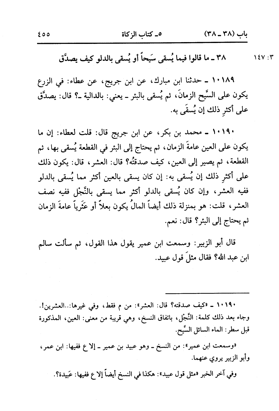 10190- حَدَّثَنَا مُحَمَّدُ بْنُ بَكْرٍ ، عَنِ ابْنِ جُرَيْجٍ ، قَالَ : قُلْتُ لِعَطَاءٍ : إنَّمَا يَكُونُ عَلَى الْعَيْنِ عَامَّةَ الزَّمَانَ ، ثُمَّ يَحْتَاجُ إلَى الْبِئْرِ فِي الْقِطعَةِ يُسْقَى بِهَا ، ثُمَّ الْقِطْعَةِ ، ثُمَّ يَصِيرُ إلَى الْعَيْنِ ، كَيْفَ صَدَقَتُهُ ؟ قَالَ : الْعُشْرُ ، قَالَ : يَكُونُ ذَلِكَ عَلَى أَكْثَرِ ذَلِكَ أَنْ يُسْقَى بِهِ ، إِنْ كَانَ يُسْقَى بِالْعَيْنِ أَكْثَرَ مِمَّا يُسْقَى بِالدَّلْوِ ، فَفِيهِ الْعُشْرُ ، وَإِنْ كَانَ يُسْقَى بِالدَّلْوِ ، أَكْثَرَ مِمَّا يُسْقَى بِالنَّجْلِ ، فَفِيهِ نِصْفُ الْعُشْرِ ، قُلْتُ : هُوَ بِمَنْزِلَةِ ذَلِكَ أَيْضًا الْمَالُ يَكُونُ بَعْلاً ، أَوْ عَثَرِيًّا عَامَّةَ الزَّمَانِ ، ثُمَّ يَحْتَاجُ إلَى الْبِئْرِ ؟ قَالَ : نَعَمْ . قَالَ أَبُو الزُّبَيْرِ : وَسَمِعْت ابْنَ عُمَيرَ يَقُولُ هَذَا الْقَوْلَ ، ثُمَّ سَأَلْتُ سَالِمَ بْنَ عَبْدِ اللهِ ؟ فَقَالَ : مِثْلَ قَوْلِ عَبَيدِِ. (3/147).