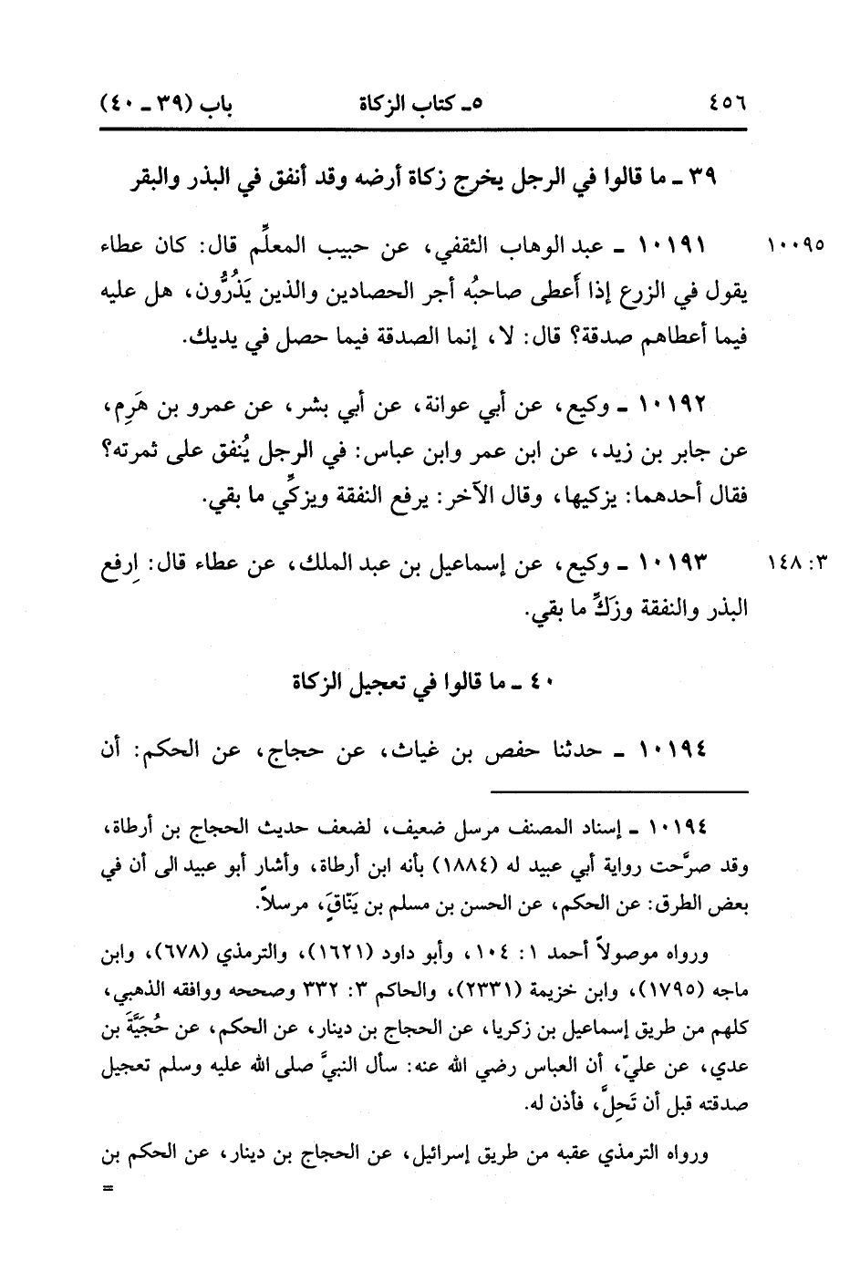 10194- حَدَّثَنَا حَفْصُ بْنُ غِيَاثٍ ، عَنْ حَجَّاجٍ ، عَنِ الْحَكَمِ ؛ أَنَّ رَسُولَ اللهِ صَلَّى الله عَلَيْهِ وَسَلَّمَ بَعَثَ سَاعِيًا عَلَى الصَّدَقَةِ فَأَتَى الْعَبَّاسَ يَسْتَسْلِّفهُ ، فَقَالَ لَهُ الْعَبَّاسُ : إنِّي أَسْلَفْتُ صَدَقَةَ مَالِي إِلَى سَنَتَيْنِ ، فَأَتَى النَّبِيَّ صَلَّى الله عَلَيْهِ وَسَلَّمَ ، فَأَخْبَرَهُ فَقَالَ : صَدَقَ عَمِّي. (3/148).