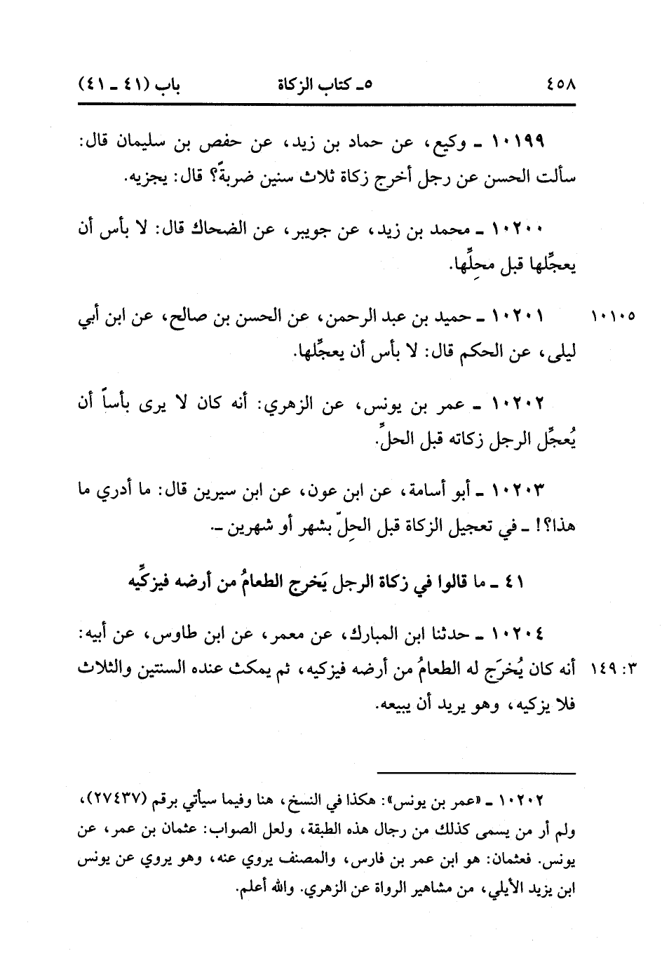 10204- حَدَّثَنَا ابْنُ الْمُبَارَك ، عَنْ مَعْمَرٍ ، عَنِ ابْنِ طَاوُوسٍ ، عَنْ أَبِيهِ ؛ أَنَّهُ كَانَ يُخْرِجُ لَهُ الطَّعَامَ مِنْ أَرْضِهِ فَيُزَكِّيهِ ، ثُمَّ يَمْكُثُ عِنْدَهُ السَّنَتَيْنِ وَالثَّلاَثَ فَلاَ يُزَكِّيه ، وَهُوَ يُرِيدُ أَنْ يَبِيعَهُ. (3/148).