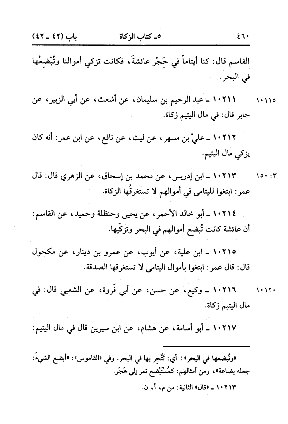 10214- حَدَّثَنَا أَبُو خَالِدٍ الأَحْمَرِِ ، عَنْ يَحْيَى ، وَحَنْظَلَةَ ، وَحُمَيْدٌ ، عَنِ الْقَاسِمِ ؛ أَنَّ عَائِشَةَ كَانَتْ تُبْضِعُ أَمْوَالَهُمْ فِي الْبَحْرِ ، وَتُزَكِّيهَا.