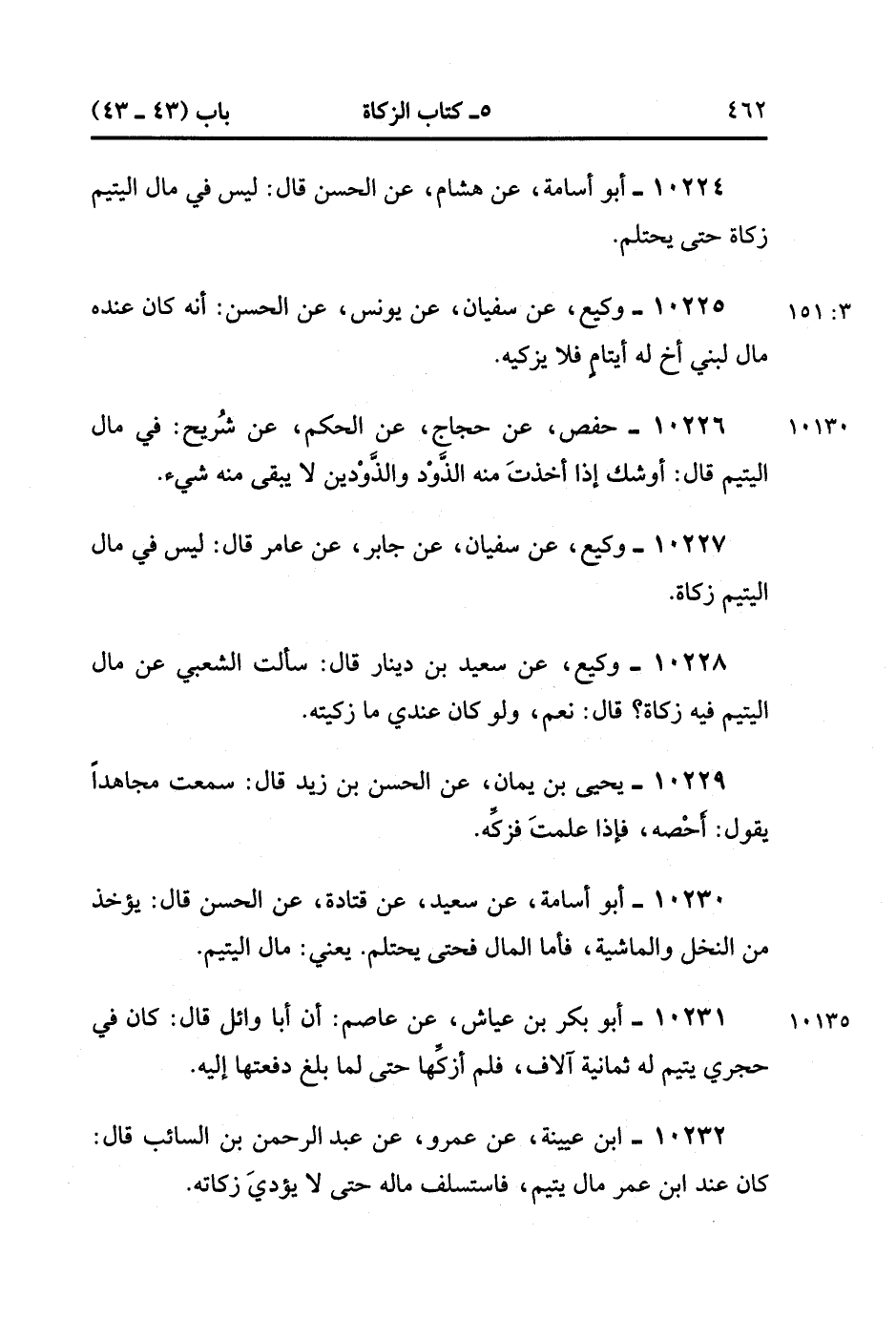 10225- حَدَّثَنَا وَكِيعٌ ، عَنْ سُفْيَانَ ، عَنْ يُونُسَ ، عَنِ الْحَسَنِ ؛ أَنَّهُ كَانَ عِنْدَهُ مَالٌ لِبَنِي أَخٍ لَهُ أَيْتَامٍ ، فَلاَ يُزَكِّيه. (3/150)