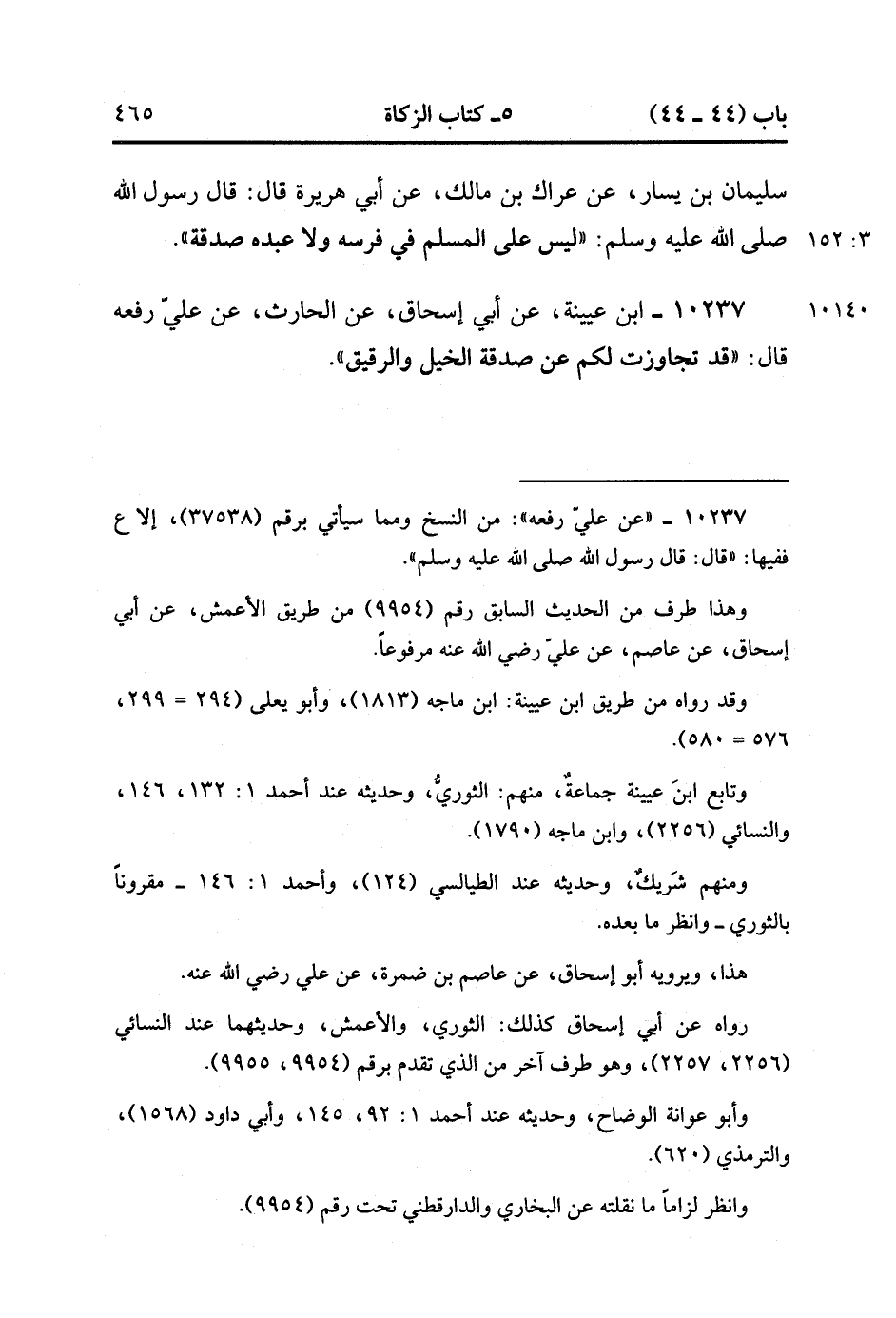 10237- حَدَّثَنَا ابْنُ عُيَيْنَةَ ، عَنْ أَبِي إِسْحَاقَ ، عَنِ الْحَارِثِ ، عَنْ عَلِيٍّ ، رَفَعَهُ ، قَالَ : قَدْ تَجَاوَزْتُ لَكُمْ عَنْ صَدَقَةِ الْخَيْلِ وَالرَّقِيقِ. (3/152).