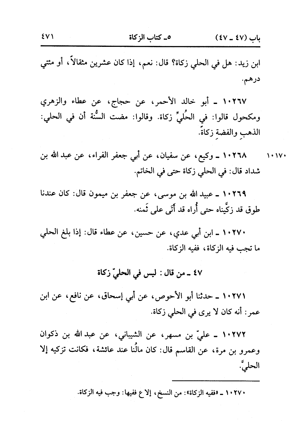 10271- حَدَّثَنَا أَبُو الأَحْوَصِِ ، عَنْ أَبِي إِسْحَاقَ ، عَنْ نَافِعٍ ، عَنِ ابْنِ عُمَرَ ؛ أَنَّهُ كَانَ لاَ يَرَى فِي الْحُلِيِّ زَكَاةً.