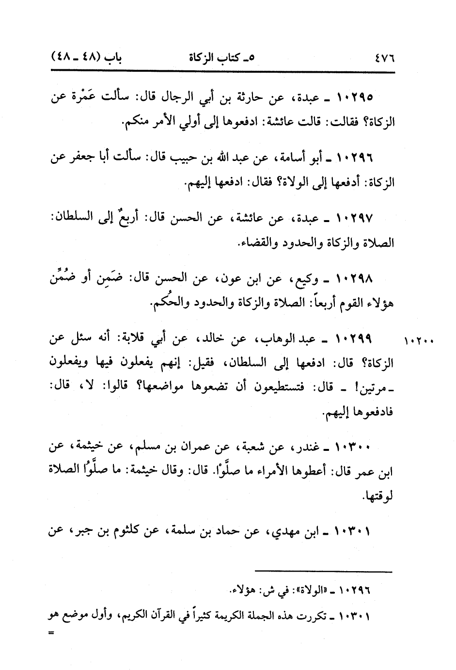 10301- حَدَّثَنَا ابْنُ مَهْدِيٍّ ، عَنْ حَمَّادِ بْنِ سَلَمَةَ ، عَنْ كُلْثُومِ بْنِ جَبْرٍ ، عَنْ مُسْلِمِ بْنِ يَسَارٍ ، أَنَّهُ قَالَ : {وَأَقِيمُوا الصَّلاَةَ وَآتَوْا الزَّكَاةَ} ، قَالَ : هَذِهِ الْفَرِيضَةُ إلَى السُّلْطَانِ. (3/157).