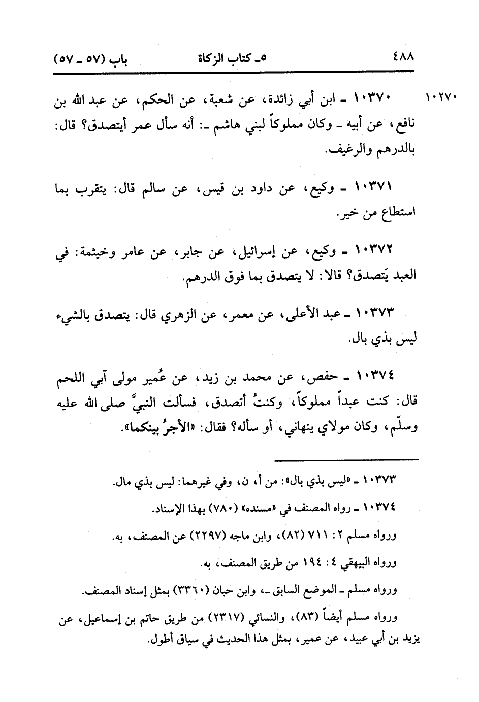 10374- حَدَّثَنَا حَفْصٌ ، عَنْ مُحَمَّدِ بْنِ زَيْدٍ ، عَنْ عُمَيْرٍ مَوْلَى آبِي اللَّحْمِ ، قَالَ : كُنْتُ عَبْدًا مَمْلُوكًا ، وَكُنْت أَتَصَدَّقُ ، فَسَأَلْتُ النَّبِيَّ صَلَّى الله عَلَيْهِ وَسَلَّمَ , وَكَانَ مَوْلاَيَ يَنْهَانِي ، أَوْ سَأَلَهُ ، فَقَالَ : الأَجْرُ بَيْنَكُمَا. (3/164).