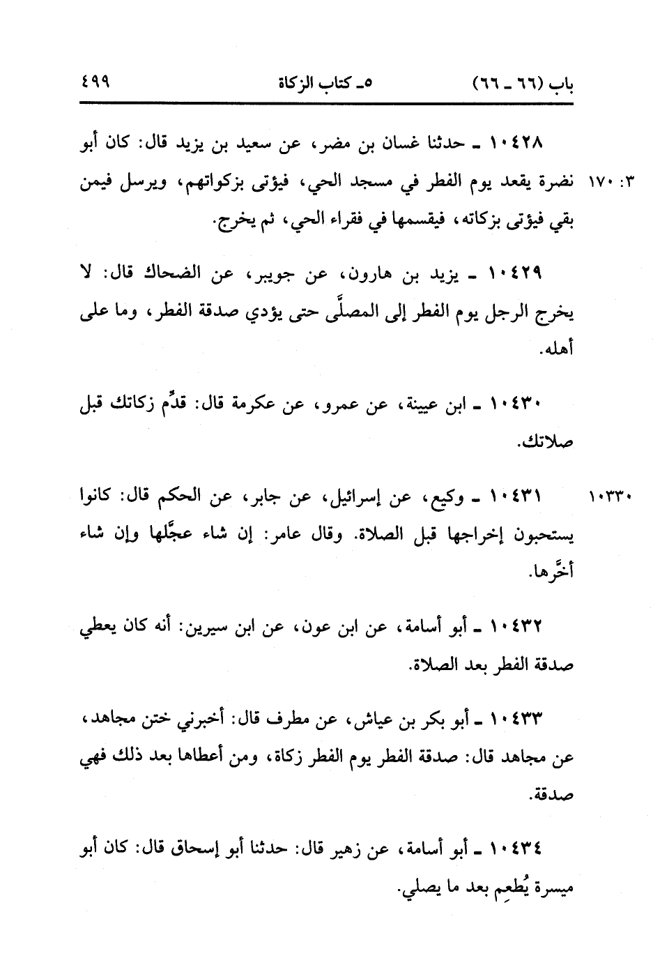10428- حَدَّثَنَا غَسَّانُ بْنُ مُضَرَ ، عَنْ سَعِيدِ بْنِ يَزِيدَ ، قَالَ : كَانَ أَبُو نَضْرَةَ يَقْعُدُ يَوْمَ الْفِطْرِ فِي مَسْجِدِ الْحَيِّ ، فَيُؤْتَى بِزَكوَاتِهِمْ وَيُرْسِلُ فِي مَنْ بَقِيَ ، فَيُؤْتَى بِزَكَاتِهِ فَيَقْسِمُهَا فِي فُقَرَاءِ الْحَيِّ ، ثُمَّ يَخْرُجُ. (3/169)