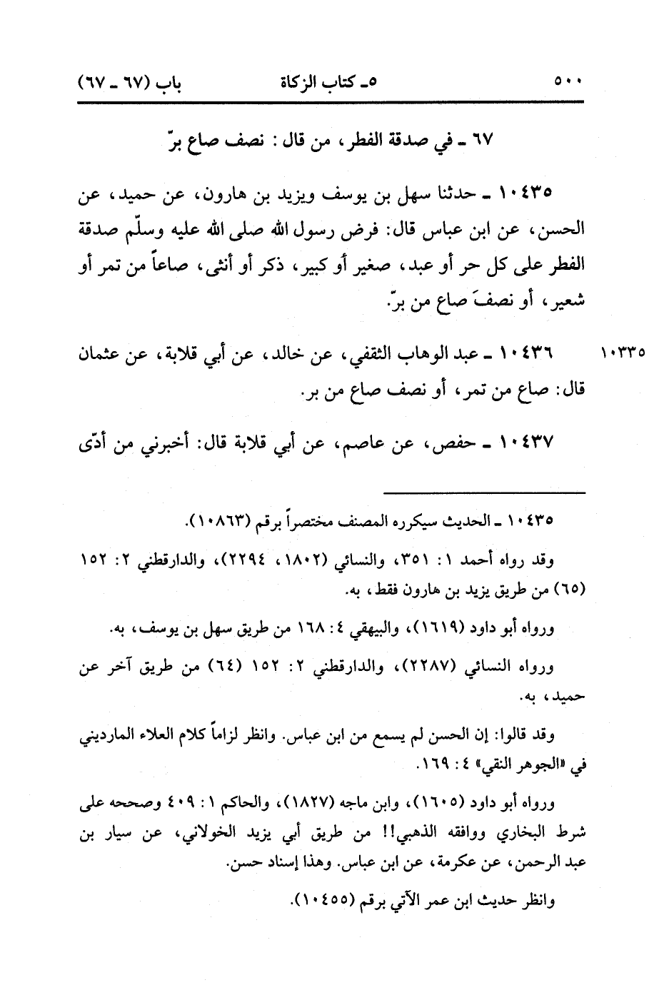 10436- حَدَّثَنَا عَبْدُ الْوَهَّابِ الثَّقَفِيُّ ، عَنْ خَالِدٍ ، عَنْ أَبِي قِلاَبَةَ ، عَنْ عُثْمَانَ ، قَالَ : صَاعٌ مِنْ تَمْرٍ ، أَوْ نِصْفُ صَاعٍ مِنْ بُرٍّ.