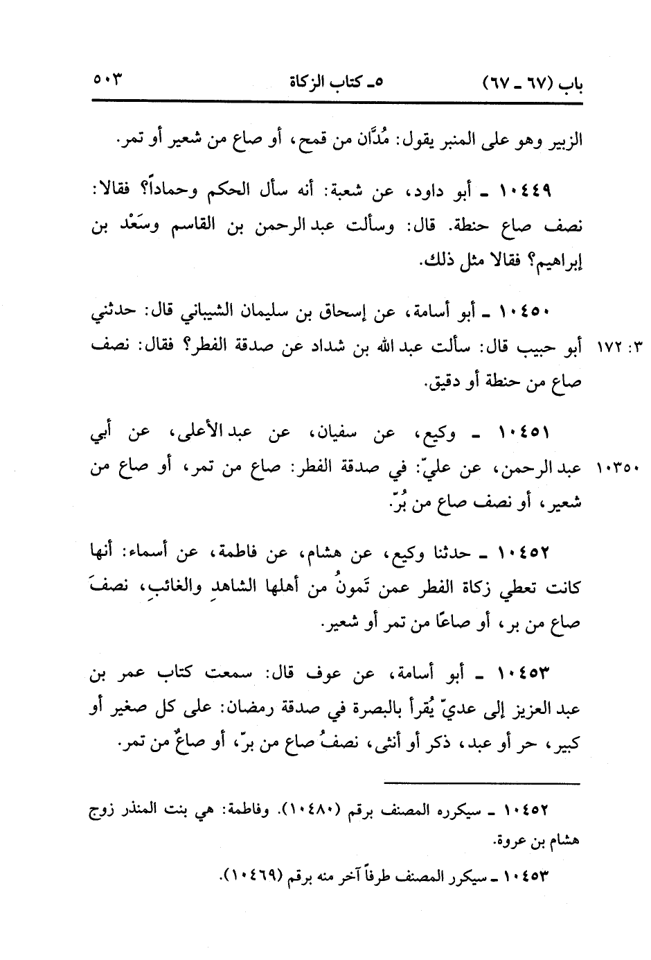 10453- حَدَّثَنَا أَبُو أُسَامَةَ ، عَنِ عَوْفٍ ، قَالَ : سَمِعْتُ كِتَابَ عُمَرَ بْنِ عَبْدِ الْعَزِيزِ إلَى عَدِيٍّ يُقْرَأُ بِالْبَصْرَةِ فِي صَدَقَةِ رَمَضَانَ : عَلَى كُلِّ صَغِيرٍ ، أَوَ كَبِيرٍ ، حُرٍّ ، أَوْ عَبْدٍ ، ذَكَرٍ ، أَوْ أُنْثَى ، نِصْفُ صَاعٍ مِنْ بُرٍّ ، أَوْ صَاعٌ مِنْ تَمْرٍ. (3/172).