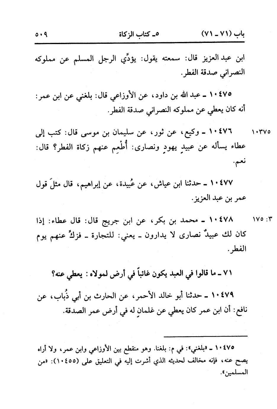 10475- حَدَّثَنَا عَبْدُ اللهِ بْنُ دَاوُد ، عَنِ الأَوْزَاعِيِّ ، قَالَ : بَلَغَنِي عَنِ ابْنِ عُمَرَ أَنَّهُ كَانَ يُعْطِي عَنْ مَمْلُوكِهِ النَّصْرَانِيِّ صَدَقَةَ الْفِطْرِ.