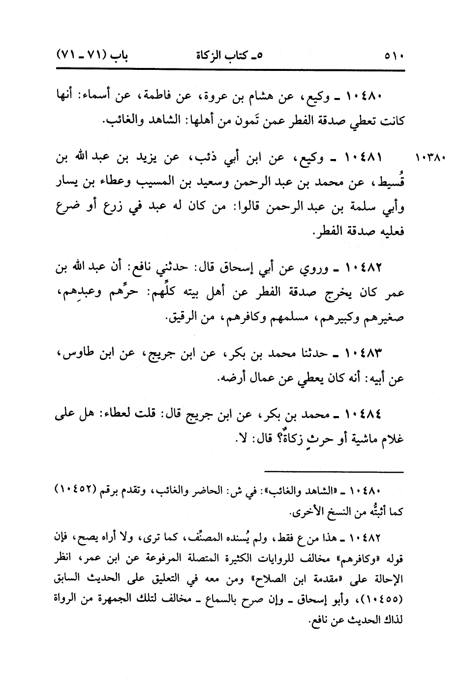 10482- وَرُوِيَ عَنْ أَبِي إِسْحَاقَ ، قَالَ : حدَّثَنِي نَافِعٌ ؛ أَنَّ عَبْدَ اللهِ بْنَ عُمَرَ كَانَ يُخْرِجُ صَدَقَةَ الْفِطْرِ عَنْ أَهْلِ بَيْتِهِ كُلِّهِمْ ؛ حُرِّهِمْ وَعَبْدِهِمْ ، صَغِيرِهِمْ وَكَبِيرِهِمْ ، وَمُسْلِمِهِمْ وَكَافِرِهِمْ مِنَ الرَّقِيقِ.