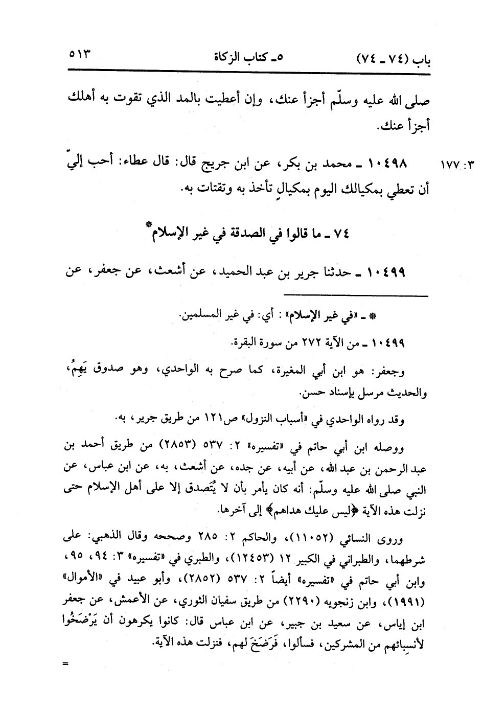 10499- حَدَّثَنَا جَرِيرُ بْنُ عَبْدِ الْحَمِيدِ ، عَنْ أَشْعَثَ ، عَنْ جَعْفَرٍ ، عَنْ سَعِيدِ بْنِ جُبَيْرٍ ، قَالَ : قَالَ رَسُولُ اللهِ صَلَّى الله عَلَيْهِ وَسَلَّمَ : لاَ تَصَدَّقُوا إِلاَّ عَلَى أَهْلِ دِينِكُمْ ، فَأَنْزَلَ اللَّهُ تَعَالَى : {لَيْسَ عَلَيْك هُدَاهُمْ} ، إلَى قَوْلِهِ : {وَمَا تُنْفِقُوا مِنْ خَيْرٍ يُوَفَّ إلَيْكُمْ} ، قَالَ : قَالَ رَسُولُ اللهِ صَلَّى الله عَلَيْهِ وَسَلَّمَ : تَصَدَّقُوا عَلَى أَهْلِ الأَدْيَانِ. (3/177).