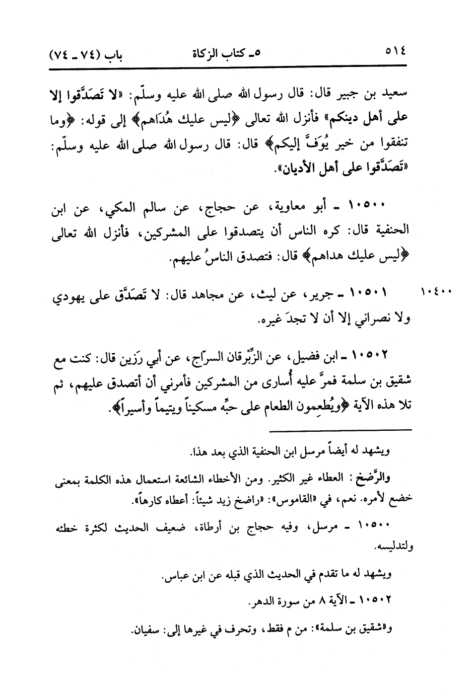 10502- حَدَّثَنَا ابْنُ فُضَيْلٍ ، عَنِ الزِّبْرِقَانِ السَّرَّاجِ ، عَنْ أَبِي رَزِينٍ ، قَالَ : كُنْتُ مَعَ شَقِيق بْنِ سَلَمَةَ ، فَمَرَّ عَلَيْهِ أُسَارَى مِنَ الْمُشْرِكِينَ فَأَمَرَنِي أَنْ أَتَصَدَّقَ عَلَيْهِمْ ، ثُمَّ تَلاَ هَذِهِ الآيَةَ : {وَيُطْعِمُونَ الطَّعَامَ عَلَى حُبِّهِ مِسْكِينًا وَيَتِيمًا وَأَسِيرًا}. (3/177).