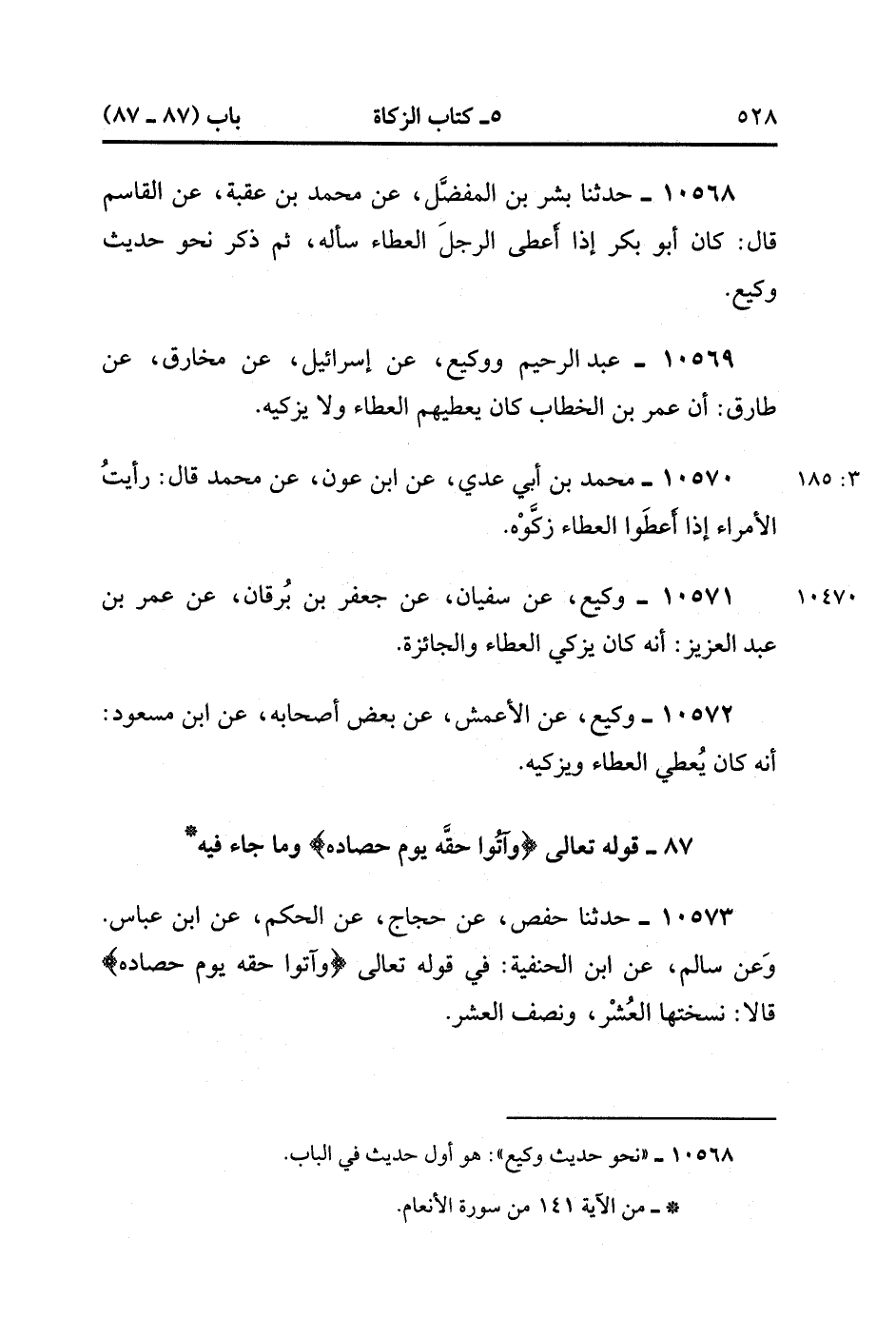 10573- حَدَّثَنَا حَفْصٌ ، عَنِ الْحَجَّاجِ ، عَنِ الْحَكَمِ ، عَنِ ابْنِ عَبَّاسٍ (ح) وَعَنْ سَالِمٍ ، عَنِ ابْنِ الْحَنَفِيَّةِ ؛ فِي قَوْلِهِ تَعَالَى : {وَآتُوا حَقَّهُ يَوْمَ حَصَادِهِ} قَالاَ : نَسَخَتْهَا الْعُشْرُ وَنِصْفُ الْعُشْرِ. (3/185).