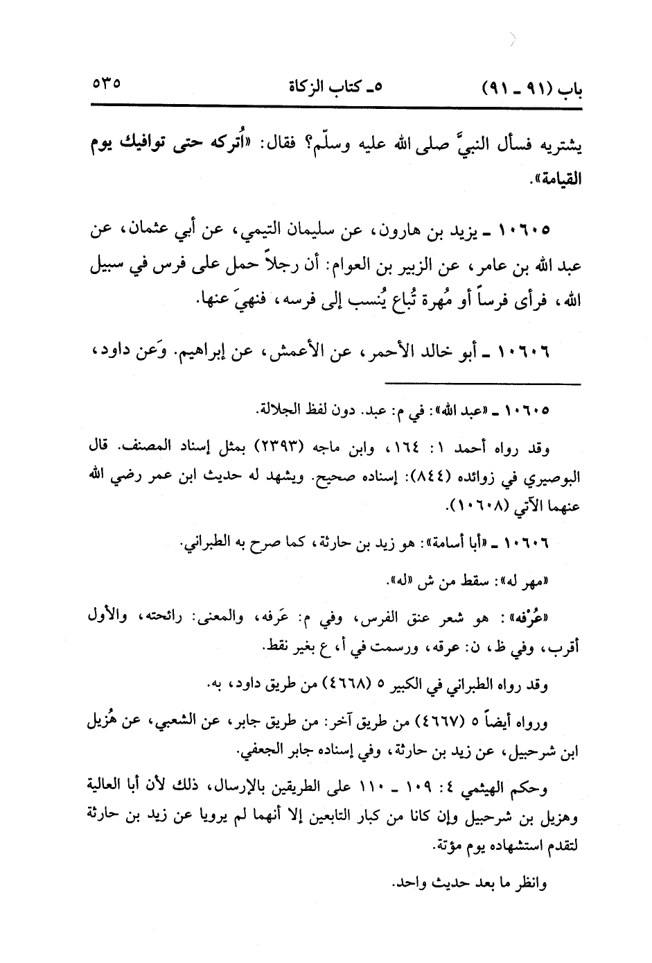 10606- حَدَّثَنَا أَبُو خَالِدٍ الأَحْمَرِِ ، عَنِ الأَعْمَشِ ، عَنْ إبْرَاهِيم (ح) وَعَنْ دَاوُدَ ، عَنْ أَبِي الْعَالِيَةِ ؛ أَنَّ أَبَا أُسَامَةَ حَمَلَ عَلَى مُهْرٍ لَهُ فِي سَبِيلِ اللهِ ، فَرَآهُ بَعْدَ ذَلِكَ نِضْوًا يُبَاعُ ، قَالَ : فَقُلْتُ لِلنَّبِيِّ صَلَّى الله عَلَيْهِ وَسَلَّمَ : قَدْ عَرَفْتُ عُرْفَهُ ، فَنَهَانِي عَنْهُ. (3/188).