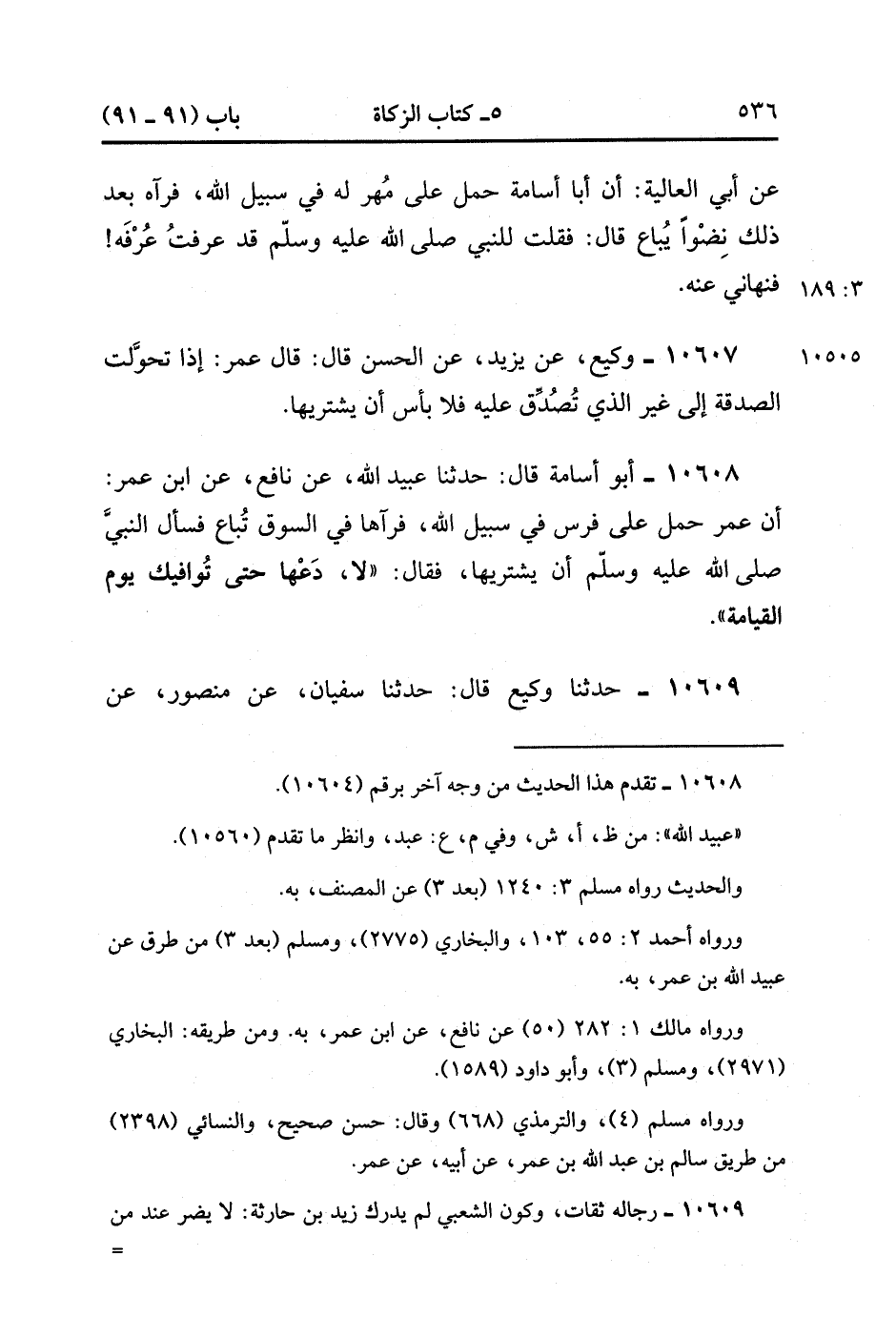 10608- حَدَّثَنَا أَبُو أُسَامَةَ , قَالَ : حدَّثَنَا عُبَيْدُ اللهِ ، عَنْ نَافِعٍ ، عَنِ ابْنِ عُمَرَ ؛ أَنَّ عُمَرَ حَمَلَ عَلَى فَرَسٍ فِي سَبِيلِ اللهِ ، فَرَآهَا فِي السُّوقِ تُبَاعُ ، فَسَأَلَ النَّبِيَّ صَلَّى الله عَلَيْهِ وَسَلَّمَ أَنْ يَشْتَرِيَهَا ، فَقَالَ : لاَ ، دَعْهَا حَتَّى تُوَافِيَك يَوْمَ الْقِيَامَةِ.