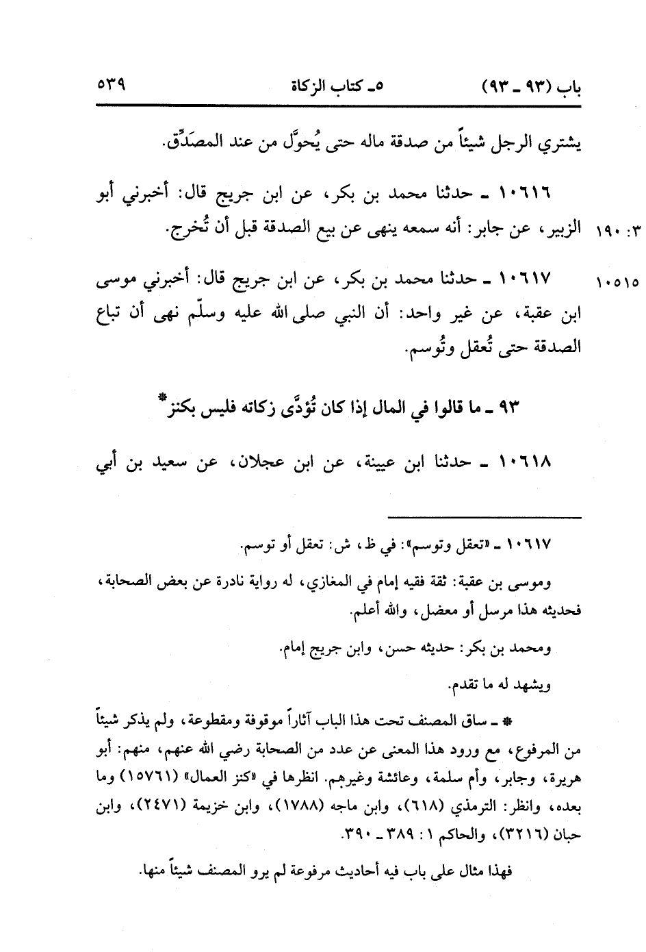 10617- حَدَّثَنَا مُحَمَّدُ بْنُ بَكْرٍ ، عَنِ ابْنِ جُرَيْجٍ ، قَالَ : أَخْبَرَنِي مُوسَى بْنُ عُقْبَةَ ، عَنْ غَيْرِ وَاحِدٍ ؛ أَنَّ النَّبِيَّ صَلَّى الله عَلَيْهِ وَسَلَّمَ نَهَى أَنْ تُبَاعَ الصَّدَقَةُ حَتَّى تُعْقَلَ وَتُوسَمَ.