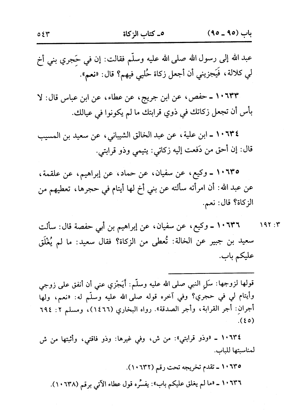10635- حَدَّثَنَا وَكِيعٌ ، عَنْ سُفْيَانَ ، عَنْ حَمَّادٍ ، عَنْ إِبْرَاهِيمَ ، عَنْ عَلْقَمَةَ ، عَنْ عَبْدِ اللهِ ؛ أَنَّ امْرَأَتَهُ سَأَلَتْهُ عَنْ بَنِي أَخٍ لَهَا أَيْتَامٍ فِي حِجْرِهَا ، تُعْطِيهِمْ مِنَ الزَّكَاةِ ؟ قَالَ : نَعَمْ. (3/191)
