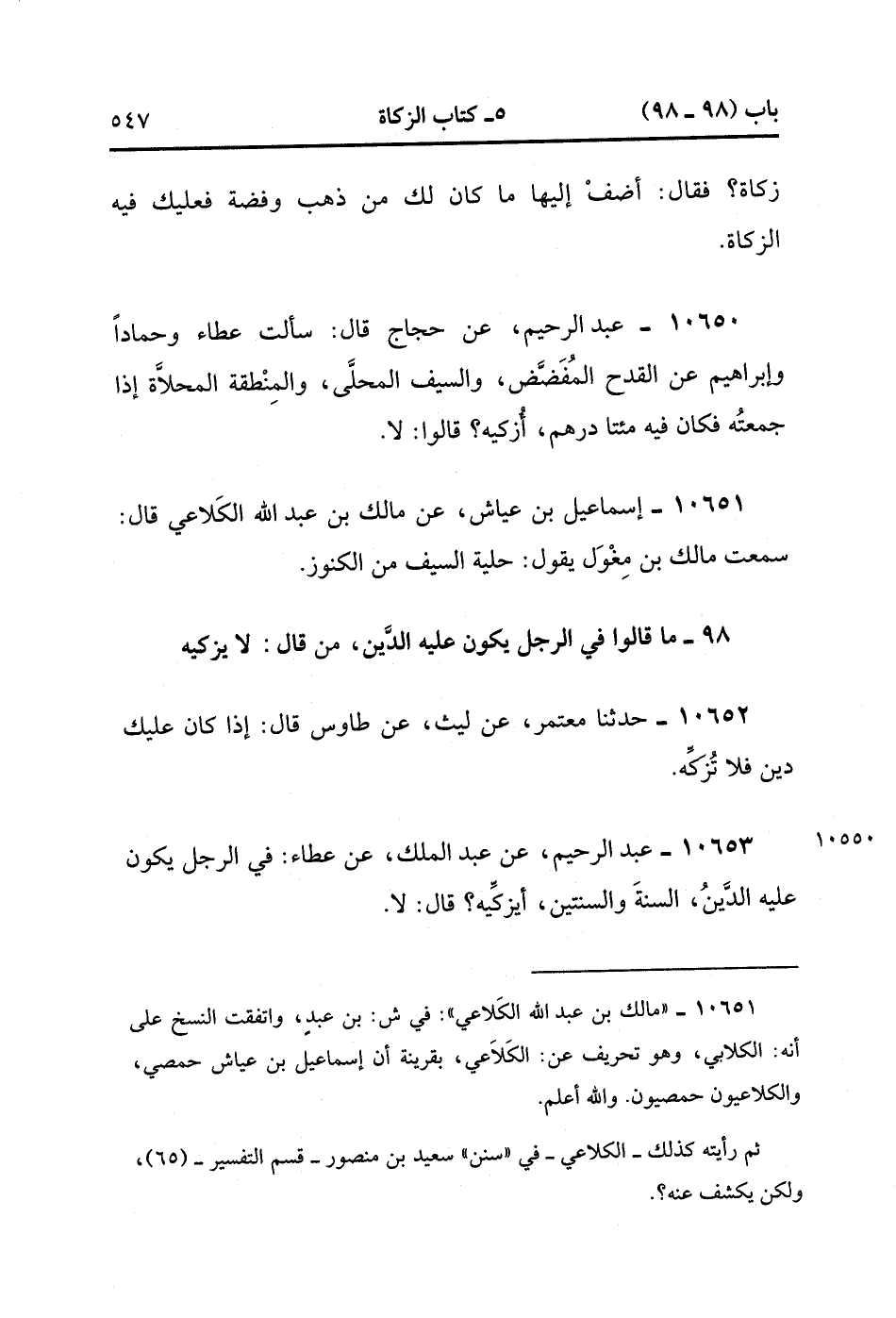 10653- حَدَّثَنَا عَبْدُ الرَّحِيمِ ، عَنْ عَبْدِ الْمَلِكِ ، عَنْ عَطَاءٍ ؛ فِي الرَّجُلِ يَكُونُ عَلَيْهِ الدَّيْنُ السَّنَةَ وَالسَّنَتَيْنِ ، أَيُزَكِّيِهِ ؟ قَالَ : لاَ. (3/193).