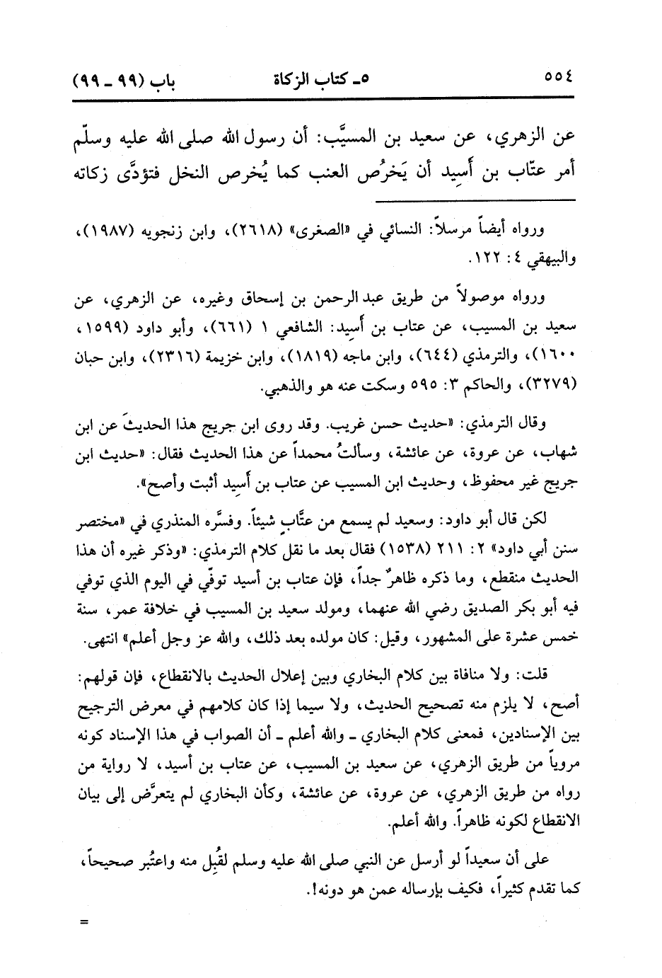10666- حَدَّثَنَا إسْمَاعِيلُ بْنُ إِبْرَاهِيمَ ، عَنْ عَبْدِ الرَّحْمَنِ بْنِ إِسْحَاقَ ، عَنِ الزُّهْرِيِّ ، عَنْ سَعِيدِ بْنِ الْمُسَيَّبِ ؛ أَنَّ رَسُولَ اللهِ صَلَّى الله عَلَيْهِ وَسَلَّمَ أَمَرَ عَتَّابَ بْنَ أُسَيْدٍ أَنْ يَخْرُصَ الَعَنَبَ كَمَا يُخْرَصُ النَّخْلَ ، فَتُؤَدَّى زَكَاتُهُ زَبِيبًا ، كَمَا تُؤَدَّى زَكَاةُ النَّخْلِ تَمْرًا ، فَتِلْكَ سُنَّةُ رَسُولِ اللهِ صَلَّى الله عَلَيْهِ وَسَلَّمَ فِي النَّخْلِ وَالَعَنَبِ. (3/195).