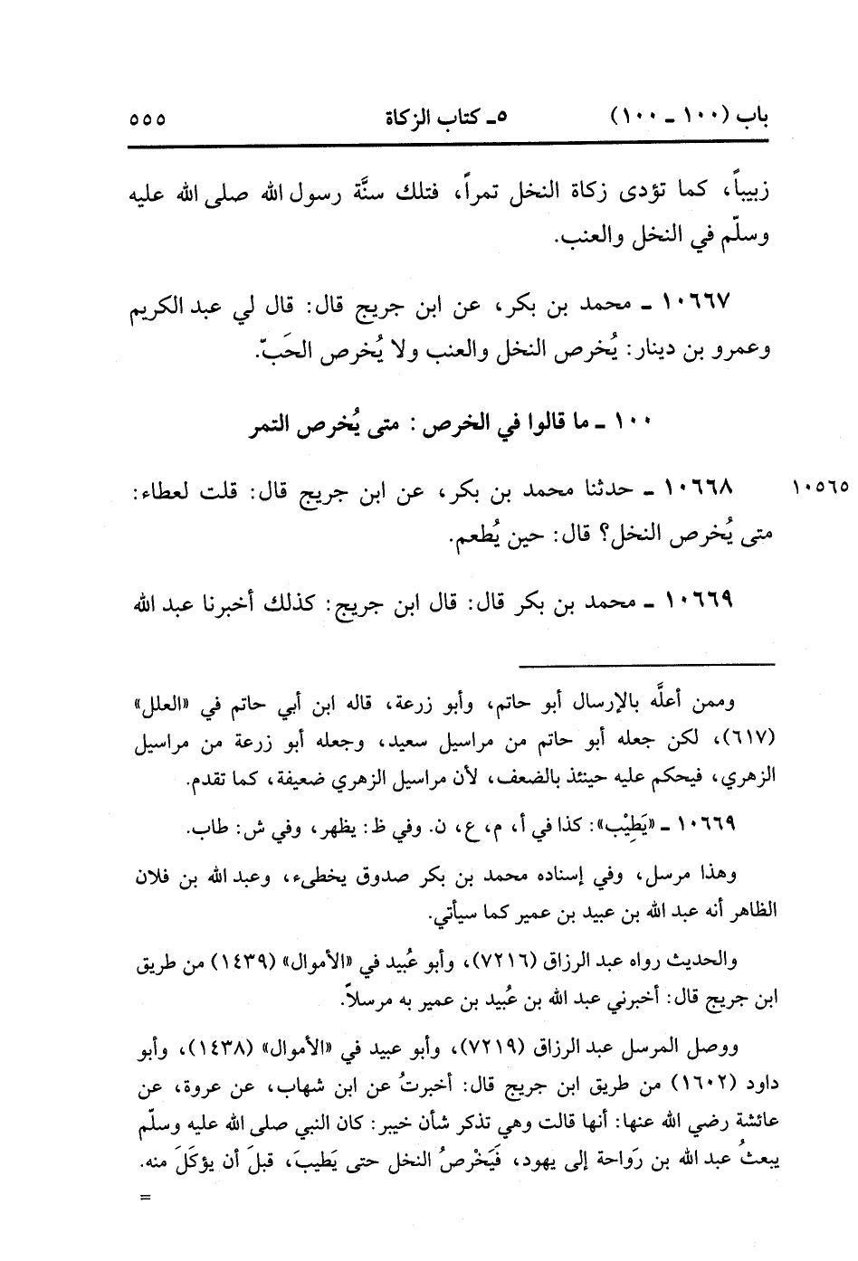 10668- حَدَّثَنَا مُحَمَّدُ بْنُ بَكْرٍ ، عَنِ ابْنِ جُرَيْجٍ ، قَالَ : قُلْتُ لِعَطَاءٍ : مَتَى يُخْرَصُ النَّخْلُ ؟ قَالَ : حينَ يُطْعَمُ.