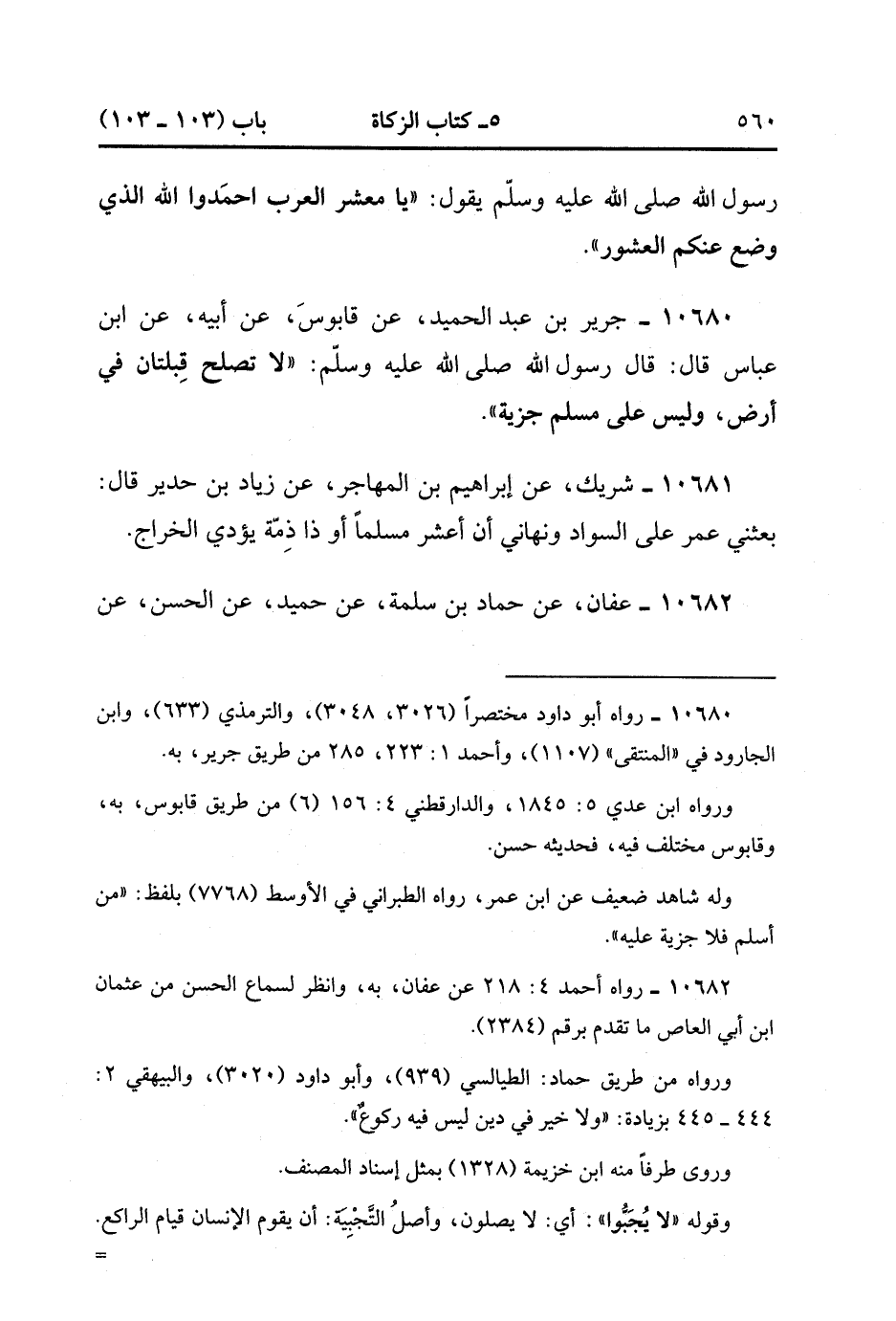 10680- حَدَّثَنَا جَرِيرُ بْنُ عَبْدِ الْحَمِيدِ ، عَنْ قَابُوسَ ، عَنْ أَبِيهِ ، عَنِ ابْنِ عَبَّاسٍ ، قَالَ : قَالَ رَسُولُ اللهِ صَلَّى الله عَلَيْهِ وَسَلَّمَ : لاَ تَصْلُحُ قِبْلَتَانِ فِي أَرْضٍ ، وَلَيْسَ عَلَى مُسْلِمٍ جِزْيَةٌ.