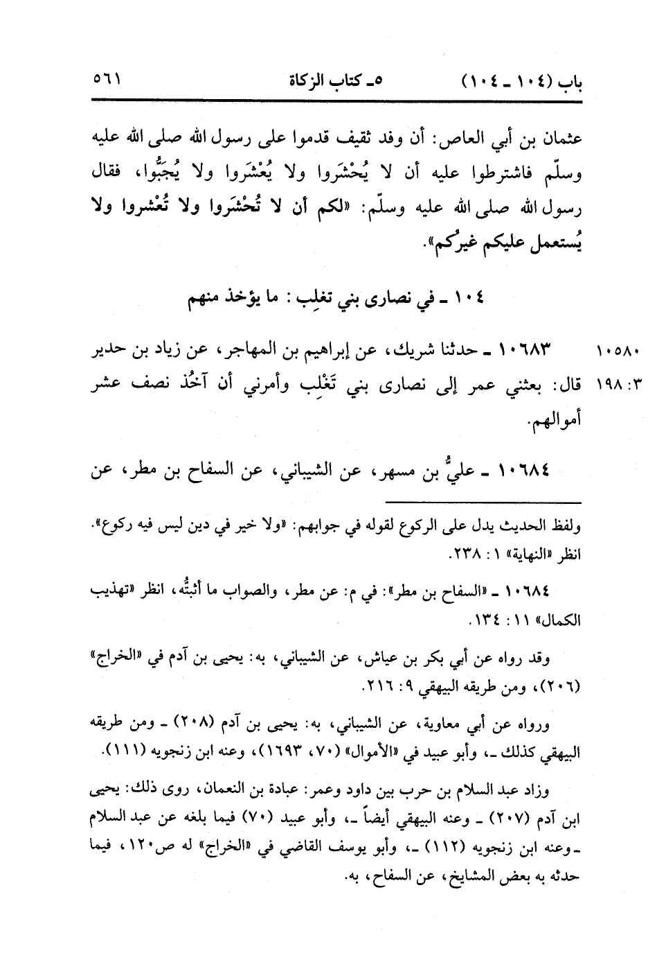10683- حَدَّثَنَا شَرِيكٌ ، عَنْ إبْرَاهِيمَ بْنِ الْمُهَاجِرِ ، عَنْ زِيَادِ بْنِ حُدَيْرٍ ، قَالَ : بَعَثَنِي عُمَرُ إلَى نَصَارَى بَنِي تَغْلِبَ ، وَأَمَرَنِي أَنْ آخُذَ نِصْفَ عُشْرِ أَمْوَالِهِمْ. (3/197)