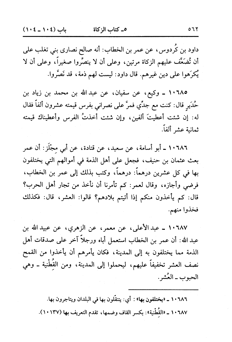 10687- حَدَّثَنَا عَبْدُ الأَعْلَى ، عَنْ مَعْمَرٍ ، عَنِ الزُّهْرِيِّ ، عَنْ عُبَيْدِ اللهِ بْنِ عَبْدِ اللهِ ؛ أَنَّ عُمَرَ بْنَ الْخَطَّابِ اسْتَعْمَلَ أَبَاهُ وَرَجُلاً آخَرَ عَلَى صَدَقَاتِ أَهْلِ الذِّمَّةِ مِمَّا يَخْتَلِفُونَ بِهِ إلَى الْمَدِينَةِ ، فَكَانَ يَأْمُرُهُمْ أَنْ يَأْخُذُوا مَِنِ الْقَمْحِ نِصْفَ الْعُشْرِ ، تَخْفِيفًا عَلَيْهِمْ ، لِيَحْمِلُوا إلَى الْمَدِينَةِ ، وَمِنَ الْقُطْنِيَّةِ ، وَهِيَ الْحُبُوبُ الْعُشْرَ. (3/198).