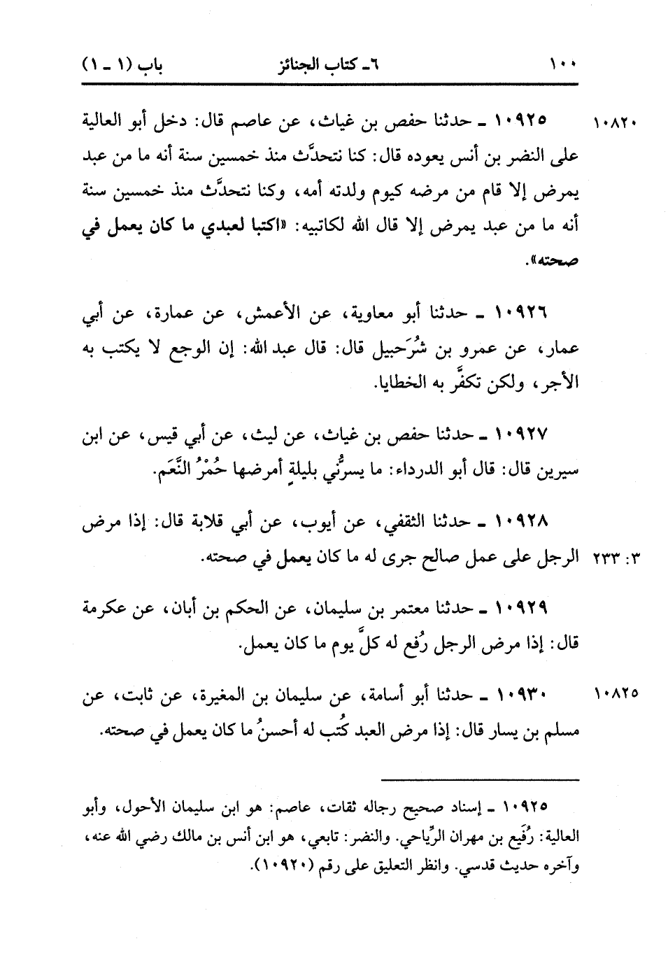10925- حَدَّثَنَا حَفْصُ بْنُ غِيَاثٍ ، عَنْ عَاصِمٍ ، قَالَ : دَخَلَ أَبُو الْعَالِيَةِ عَلَى النَّضْرِ بْنِ أَنَسٍ يَعُودُهُ ، قَالَ : كُنَّا نَتَحَدَّثُ مُنْذُ خَمْسِينَ سَنَةً ، أَنَّهُ مَا مِنْ عَبْدٍ يَمْرَضُ إِلاَّ قَامَ مِنْ مَرَضِهِ كَيَوْمِ وَلَدَتْهُ أُمُّهُ وَكُنَّا نَتَحَدَّثُ مُنْذُ خَمْسِينَ سَنَةً ، أَنَّهُ مَا مِنْ عَبْدٍ يَمْرَضُ إِلا قَالَ اللَّهُ لِكَاتِبَيْهِ : اكْتُبَا لِعَبْدِي مَا كَانَ يَعْمَلُ فِي صِحَّتِهِ.