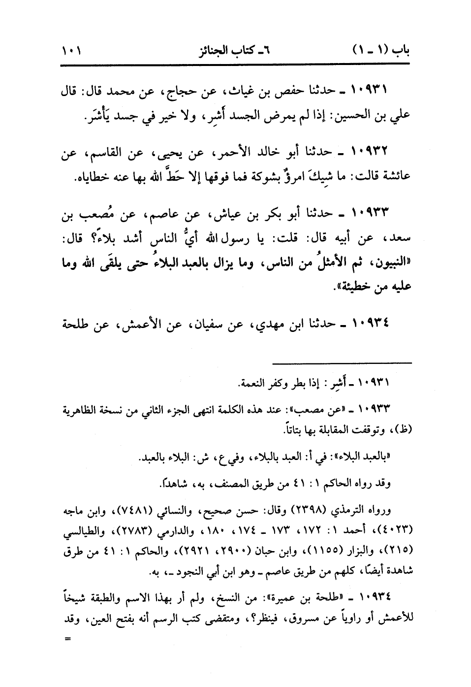 10933- حَدَّثَنَا أَبُو بَكْرِ بْنُ عَيَّاشٍ ، عَنْ عَاصِمٍ ، عَنْ مُصْعَبِ بْنِ سَعْدٍ ، عَنْ أَبِيهِ ، قَالَ : قُلْتُ يَا رَسُولَ اللهِ أَيُّ النَّاسِ أَشَدُّ بَلاَءً ، قَالَ : النَّبِيُّونَ ، ثُمَّ الأَمْثَلُ مِنَ النَّاسِ وَمَا يَزَالُ بِالْعَبْدِ الْبَلاَءُ حَتَّى يَلْقَى اللَّهَ وَمَا عَلَيْهِ مِنْ خَطِيئَةٍ.