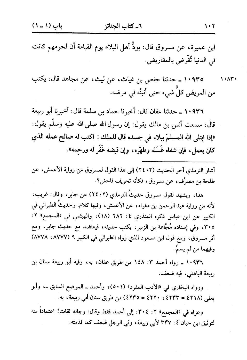10936- حَدَّثَنَا عَفَّانُ , قَالَ : أَخْبَرَنَا حَمَّادُ بْنُ سَلَمَةَ , قَالَ : أَخْبَرَنَا أَبُو رَبِيعَةَ ، قَالَ : سَمِعْتُ أَنَسَ بْنَ مَالِكٍ يَقُولُ : إنَّ رَسُولَ اللهِ صَلَّى الله عَلَيْهِ وَسَلَّمَ يَقُولُ : إذَا ابْتَلَى اللَّهُ الْمُسْلِمَ بِبَلاَءٍ فِي جَسَدِهِ ، قَالَ لِلْمَلَكِ اكْتُبْ لَهُ صَالِحَ عَمَلِهِ الَّذِي كَانَ يَعْمَلُ فَإِنْ شَفَاهُ غَسَلَهُ وَطَهَّرَهُ , وَإِنْ قَبَضَهُ غَفَرَ لَهُ وَرَحِمَهُ. (3/233).