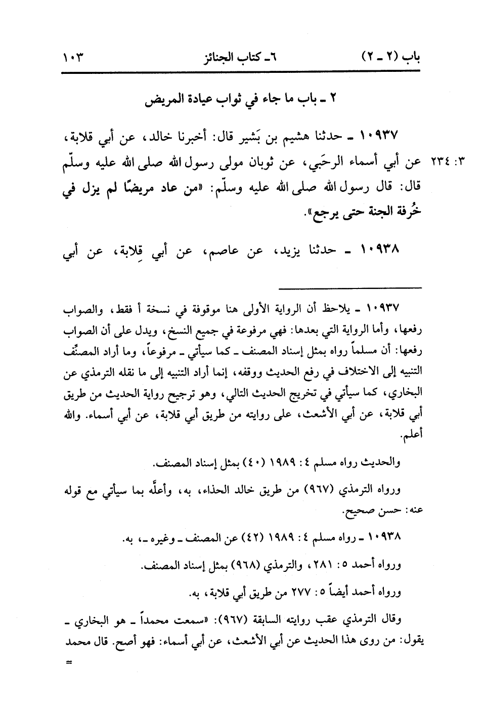 10937- حَدَّثَنَا هُشَيْمٌ ، عَنْ بَشِيرٍ , قَالَ : أَخْبَرَنَا خَالِدٌ ، عَنْ أَبِي قِلاَبَةَ ، عَنْ أَبِي أَسْمَاءَ الرَّحَبِيِّ ، عَنْ ثَوْبَانَ مَوْلَى رَسُولِ اللهِ صَلَّى الله عَلَيْهِ وَسَلَّمَ ، قَالَ : قَالَ رَسُولُ اللهِ صَلَّى الله عَلَيْهِ وَسَلَّمَ : مَنْ عَادَ مَرِيضًا لَمْ يَزَلْ فِي خُرْفَةِ الْجَنَّةِ حَتَّى يَرْجِعَ. (3/233)