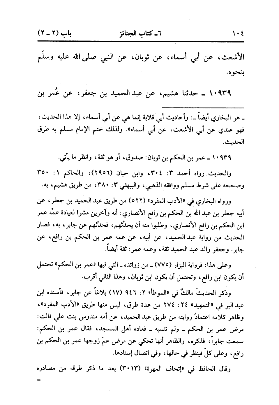 10939- حَدَّثَنَا هُشَيْمٌ ، عَنْ عَبْدِ الْحَمِيدِ بْنِ جَعْفَرٍ ، عَنْ عُمَرَ بْنِ الْحَكَمِ بْنِ ثَوْبَانَ ، عَنْ جَابِرِ بْنِ عَبْدِ اللهِ ، قَالَ : قَالَ رَسُولُ اللهِ صَلَّى الله عَلَيْهِ وَسَلَّمَ : مَنْ عَادَ مَرِيضًا لَمْ يَزَلْ يَخُوضُ فِي الرَّحْمَةِ حَتَّى يَجْلِسَ فَإِذَا جَلَسَ اغْتَمَسَ فِيهَا. (3/234).