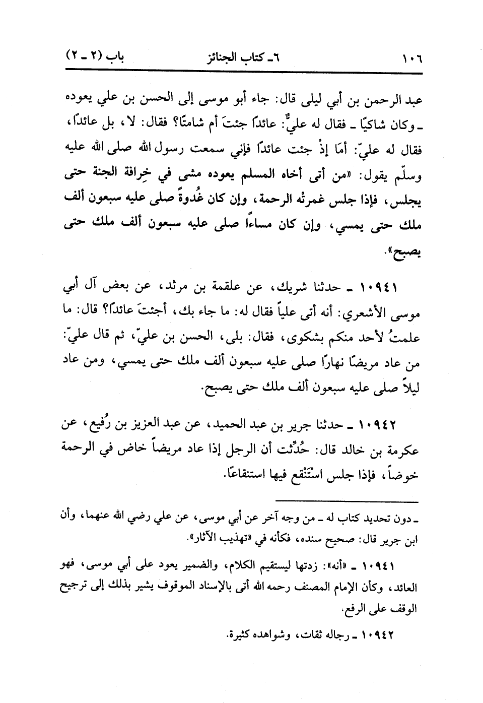 10941- حدَّثنا شَرِيك ، عَنْ عَلْقَمة بن مَرْثَد ، عَنْ بعض آل أَبي مُوسَى الأَشْعَرِيِّ ، أَنَّهُ أَتَى عَلِيًّا ، فَقَالَ لَهُ : مَا جَاءَ بِكَ ؟ أَجِئْتَ عَائِدًا ؟ قَالَ : مَا عَلِمْتُ لأَحَدٍ مِنْكُمْ بِشَكْوَى ، فَقَالَ : بَلَى ، الْحَسَنُ بْنُ عَلِيٍّ ، ثُمَّ قَالَ عَلِيٌّ : مَنْ عَادَ مَرِيضًا نَهَارًا ، صَلَّى عَلَيْهِ سَبْعُونَ أَلْفَ مَلَكٍ ، حَتَّى يُمْسِيَ ، وَمَنْ عَادَ لَيْلاً ، صَلَّى عَلَيْهِ سَبْعُونَ أَلْفَ مَلَكٍ ، حَتَّى يُصْبِحَ.
