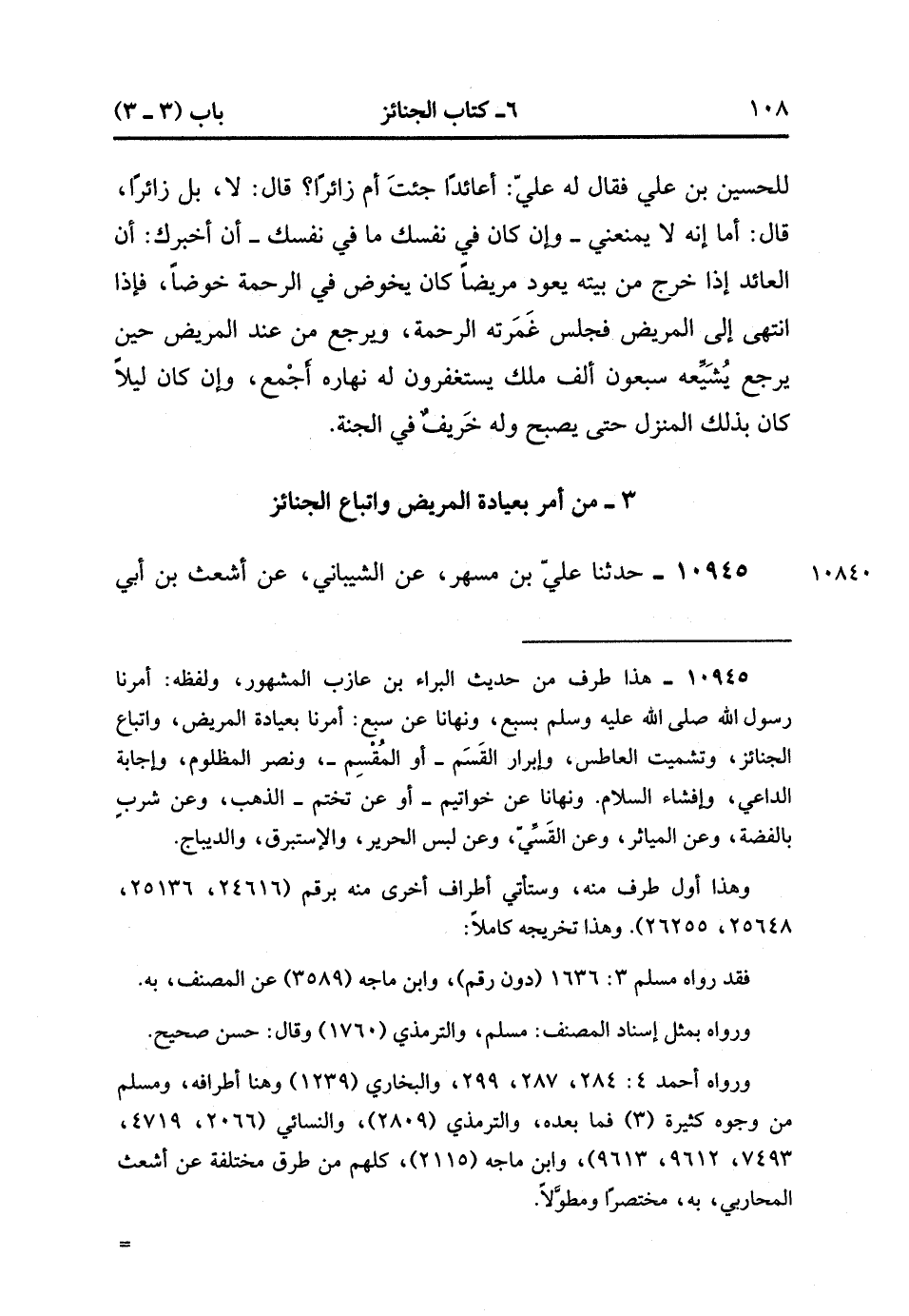 10944- حَدَّثَنَا عَبْدُ اللهِ بْنُ نُمَيْرٍ , قَالَ : حدَّثَنَا مُوسَى الْجُهَنِيُّ ، قَالَ : سَمِعْتُ سَعِيدَ بْنَ أَبِي بُرْدَةَ ، قَالَ : حَدَّثَنِي أَبِي ، أَنَّ أَبَا مُوسَى انْطَلَقَ عَائِدًا لِلْحُسَيْنِ بْنِ عَلِيٍّ ، فَقَالَ لَهُ عَلِيٌّ : أَعَائِدًا جِئْتَ ، أَوْ زَائِرًا ؟ قَالَ : لاَ بَلْ زَائِرًا ، قَالَ : أَمَا إِنَّهُ لاَ يَمْنَعُنِي ، وَإِنْ كَانَ فِي نَفْسِكَ مَا فِي نَفْسِكَ أَنْ أُخْبِرَك؛ أَنَّ الْعَائِدَ إذَا خَرَجَ مِنْ بَيْتِهِ يَعُودُ مَرِيضًا ، كَانَ يَخُوضُ فِي الرَّحْمَةِ خَوْضًا ، فَإِذَا انْتَهَى إلَى الْمَرِيضِ فَجَلَسَ غَمَرَتْهُ الرَّحْمَةُ وَيَرْجِع مِنْ عِنْدِ الْمَرِيضِ ، حِينَ يَرْجِعُ ، يُشَيِّعُهُ سَبْعُونَ أَلْفَ مَلَكٍ ، يَسْتَغْفِرُونَ لَهُ نَهَارَه أَجْمَعَ ، وَإِنْ كَانَ لَيْلاً ، كَانَ بِذَلِكَ الْمَنْزِلِ حَتَّى يُصْبِحَ ، وَلَهُ خَرِيفٌ فِي الْجَنَّةِ. (3/235).