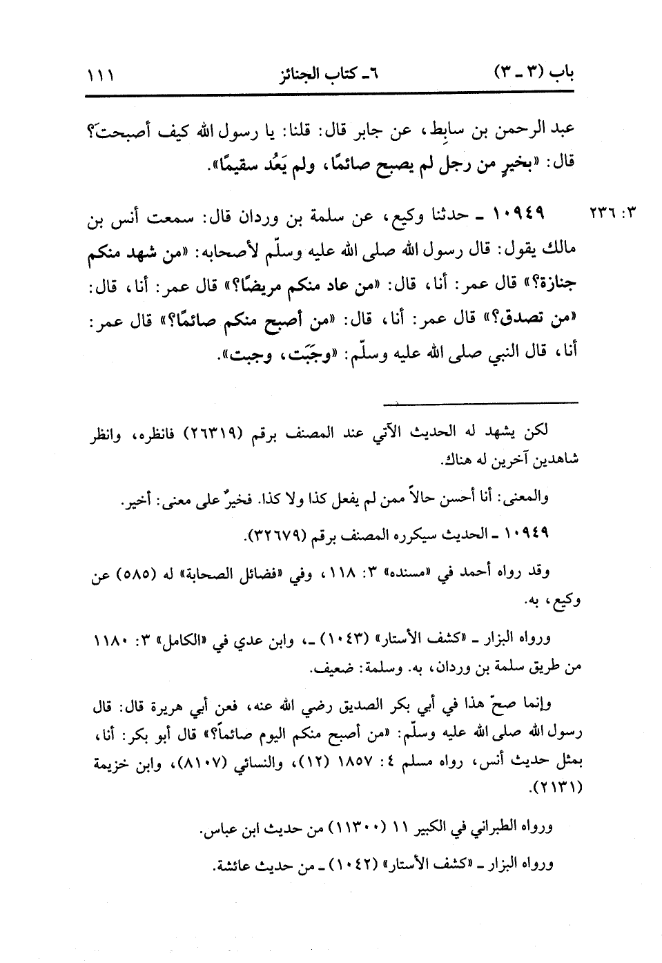 10949- حَدَّثَنَا وَكِيعٌ ، عَنْ سَلَمَةَ بْنِ وَرْدَانَ ، قَالَ : سَمِعْتُ أَنَسَ بْنَ مَالِكٍ يَقُولُ ، قَالَ رَسُولُ اللهِ صَلَّى الله عَلَيْهِ وَسَلَّمَ لأَصْحَابِهِ : مَنْ شَهِدَ مِنْكُمْ جِنَازَةً ؟ قَالَ عُمَرُ أَنَا ، قَالَ : مَنْ عَادَ مِنْكُمْ مَرِيضًا ؟ قَالَ عُمَرُ أَنَا ، قَالَ : مَنْ تَصَدَّقَ ؟ قَالَ عُمَرُ أَنَا ، قَالَ : مَنْ أَصْبَحَ مِنْكُمْ صَائِمًا ؟ قَالَ عُمَرُ أَنَا ، قَالَ النَّبِيُّ صَلَّى الله عَلَيْهِ وَسَلَّمَ : وَجَبَتْ وَجَبَتْ. (3/235).